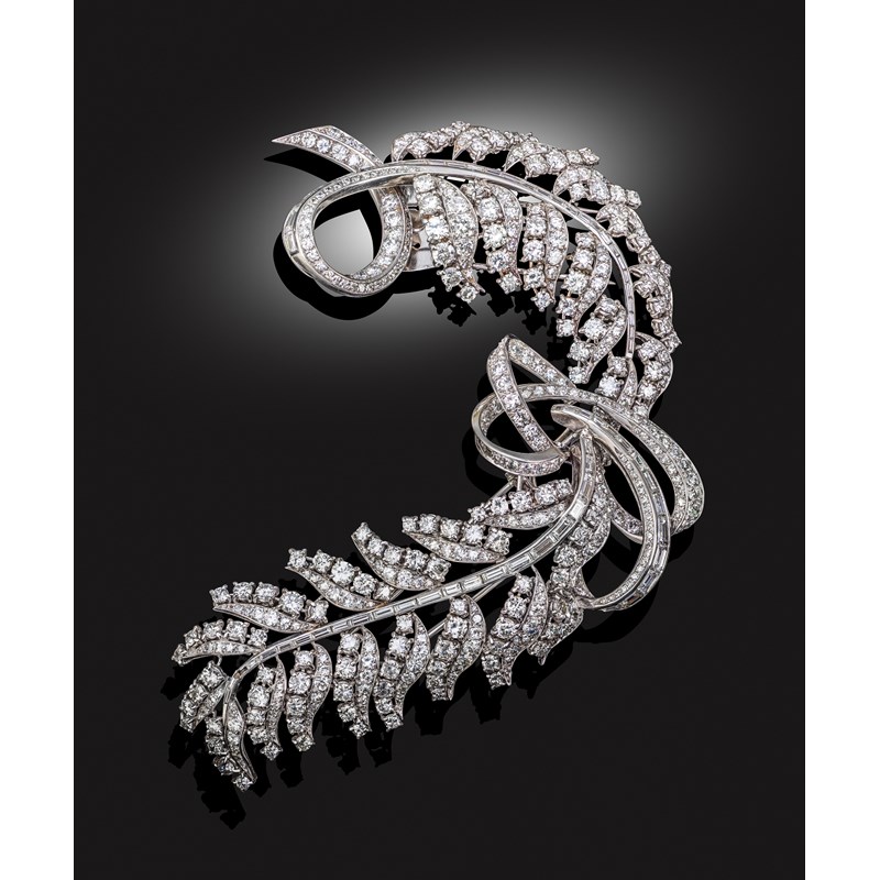 An impressive French diamond-set floral corsage, 1950s, separating to form two brooches, each piece set with graduated circular diamonds to the leaves and with a central stem and upper tendrils of baguette-shaped and further circular-cut diamonds in white gold and platinum, French control mark and unidentified maker's lozenge mark, initials SC and further unidentified marks, the separated brooches 8.0 and 9.5cm long
