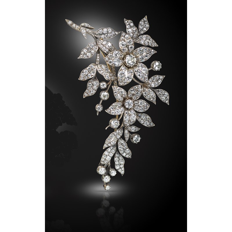 A late Victorian diamond-set corsage brooch, of floral design and set overall with graduated old circular-cut diamonds in sliver and gold, the two flower heads detach to be worn as hair ornaments, 12cm long, fitted box containing two aigrette prongs (one en tremblant)