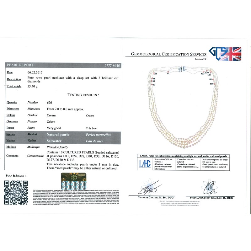 Accompanied by report number 5777-8646 from GCS, London dated 6th February 2017 from GCS, London stating that the cream pearls are natural saltwater with the exception of 10 cultured pearls.