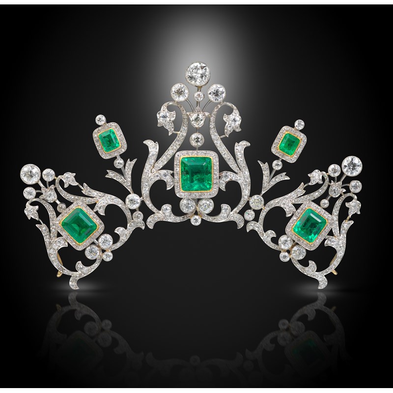 An Edwardian emerald and diamond necklace, converting to a tiara, the three principal rectangular-shaped emeralds are each millegrain-set within a surround of small circular-cut diamonds, in platinum and yellow gold, within open-work Art Nouveau-inspired mounts set with graduated circular-cut diamonds and separated with smaller emerald and diamond drops, the detachable necklace mounted with groups of three graduated circular-cut diamonds and each joined with a diamond-set scroll, with two additional loose scroll links for the necklace, the centre section detaches which allows it to be worn as a tiara (frame missing), necklace 42.5cm (not including spare links), fitted case by Collingwood