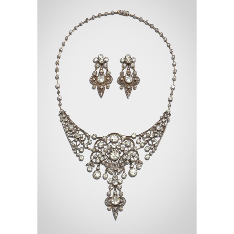 A late 19th century diamond suite of jewellery, comprising an elaborate diamond necklace, pierced and millegrain-set with graduated old circular-cut diamonds in silver and gold, the central scallop-edged section suspending graduated articulated diamonds, the five principal diamonds weigh approximately 2.15cts, 1.50cts, 1.10cts, 1.50cts and 1.45cts, on tapered diamond panels and a diamond-set back chain set on knife-edge links, 40cm long, with a matching pair of diamond drop earrings, the upper diamond cluster suspends two articulated diamonds and a diamond quatrefoil in pierced silver and gold setting, 4.3cm long, case