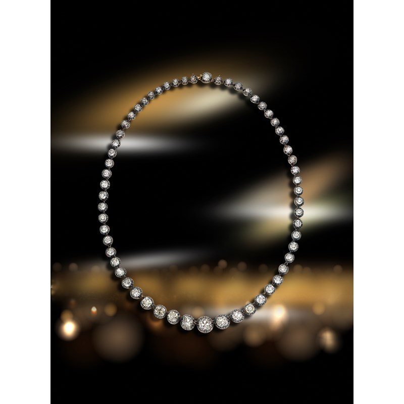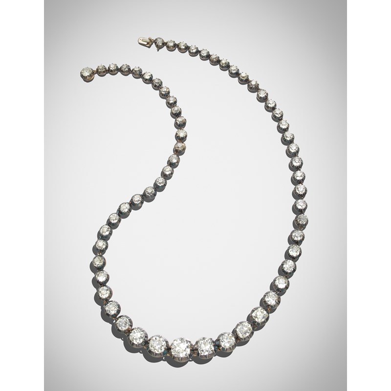 A late Victorian diamond rivière necklace, the graduated cushion-shaped diamonds are set in silver and gold cut-down collets, the nine principal diamonds weigh approximately 19.40cts total, the seven centre principal diamonds detach individually and have separate fittings, 52cm long, fitted case by Collingwood