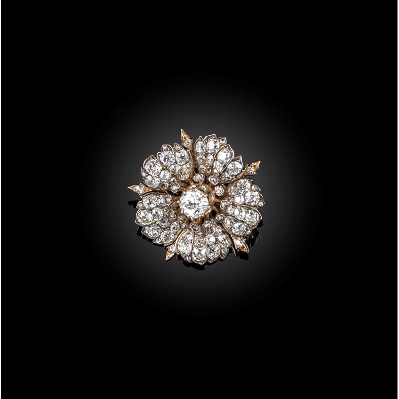 A diamond brooch, mid 19th century, modelled as a wild rose, centring on a cushion-shaped diamond, its pistils set with rose-cut diamonds, its undulating petals set with cushion-shaped and rose-cut diamonds, mounted in silver and gold, the gold sepals appearing between the petals, diameter 3.4cm, detachable brooch fitting