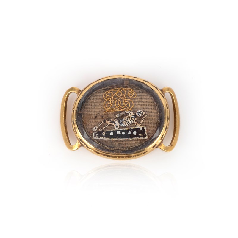 A rare Stuart Crystal mourning slide, circa 1690, of oval outline set with a faceted section of rock crystal, covering a reclining skeleton in painted card beneath entwined initials in gold wire, on a ground of woven hair, mounted in gold, length 2.6cm