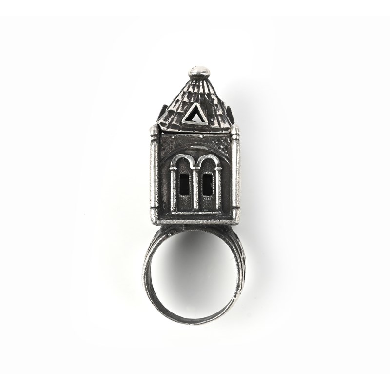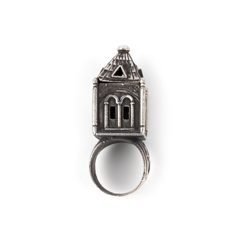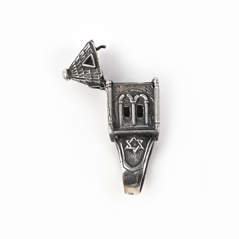 A Jewish silver wedding ring, Russia, designed as a temple, symbolising the temple in Jerusalem and the new marital household of the bride and groom, modelled in silver with a hinged roof, the shoulders decorated with stars of David, size X1/2, Russian marks for silver