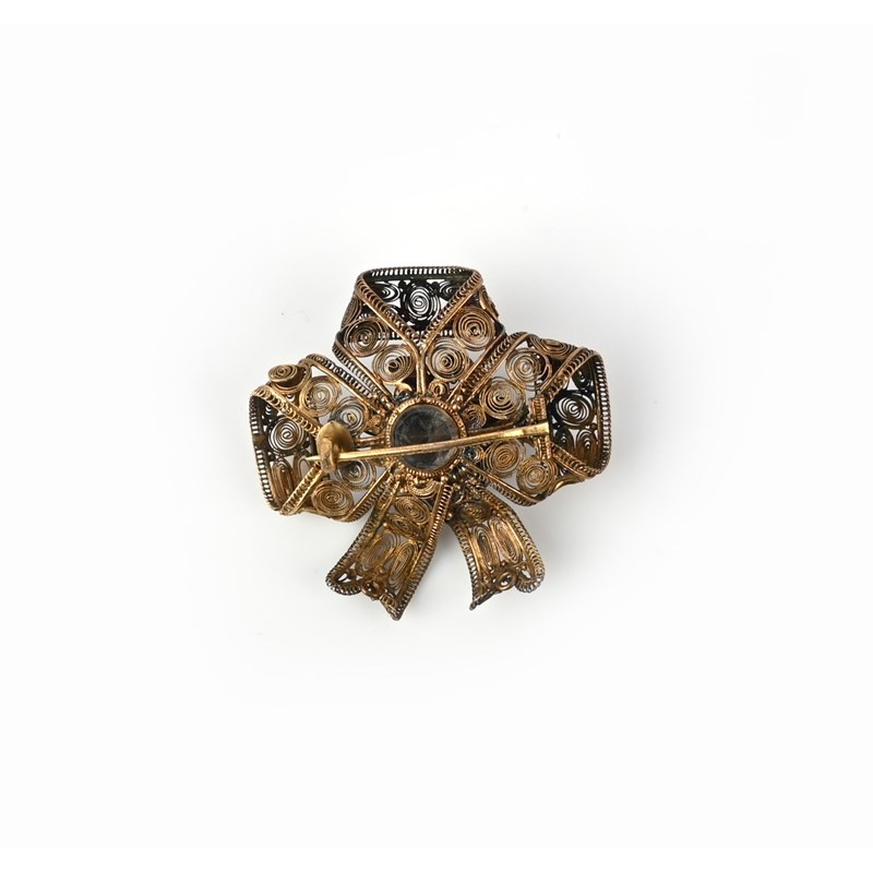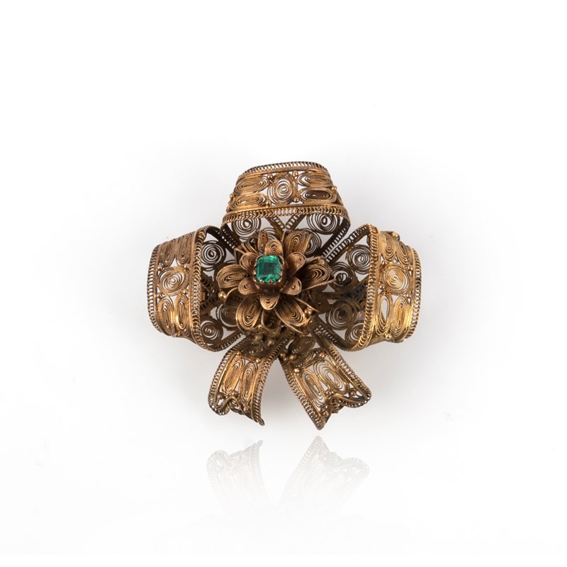 A Georgian gold and emerald locket brooch, early 19th century, designed as a ribbon bow intricately constructed from gold filigree, the central floral motif set with a step-cut emerald, the reverse with a glazed locket compartment for hair, length 3.7cm