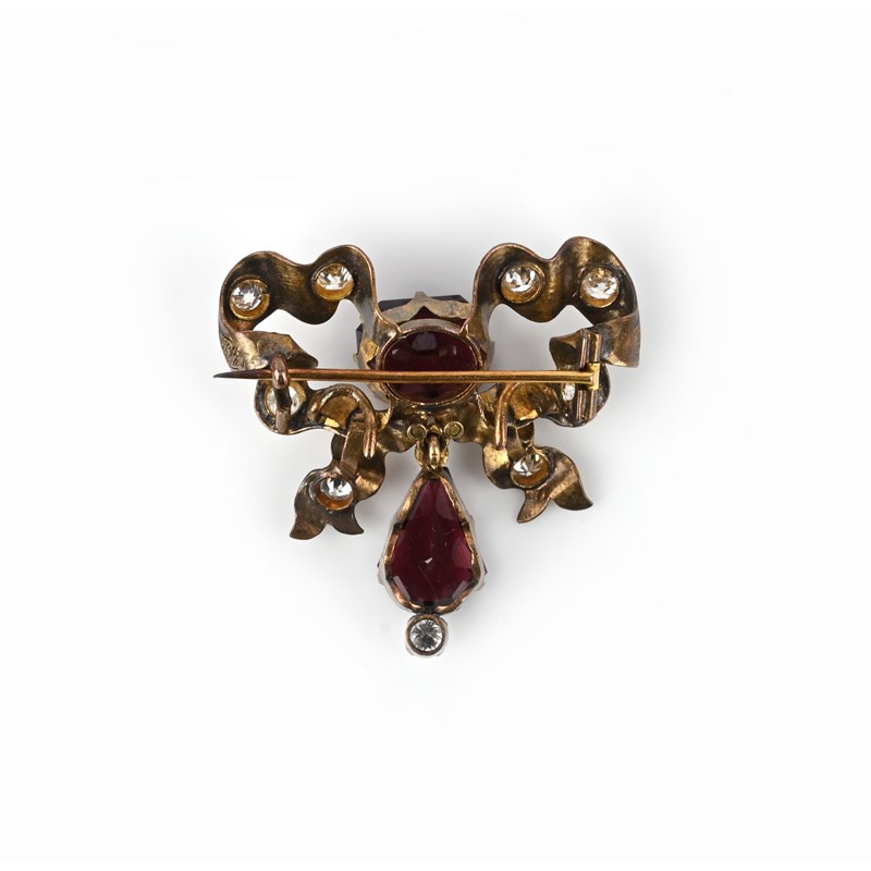 A garnet and diamond brooch, designed as a ribbon bow, set with a step-cut and a pear-shaped garnet and circular-cut diamonds, length 3.4cm
