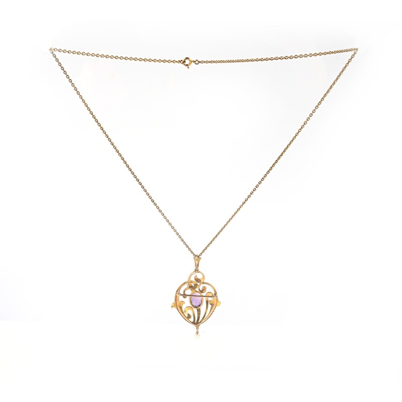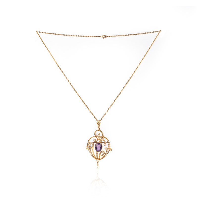 An Edwardian amethyst and seed pearl pendant, circa 1910, of asymmetrical design in the Art Nouveau style, set with half seed pearls and suspending a pearl pendant, centring on an oval amethyst, the reverse inscribed EP HP and dated 1910, to a fine gold chain, pendant with brooch fittings, length 5.3cm including bail, chain length 43cm, pearls untested, case