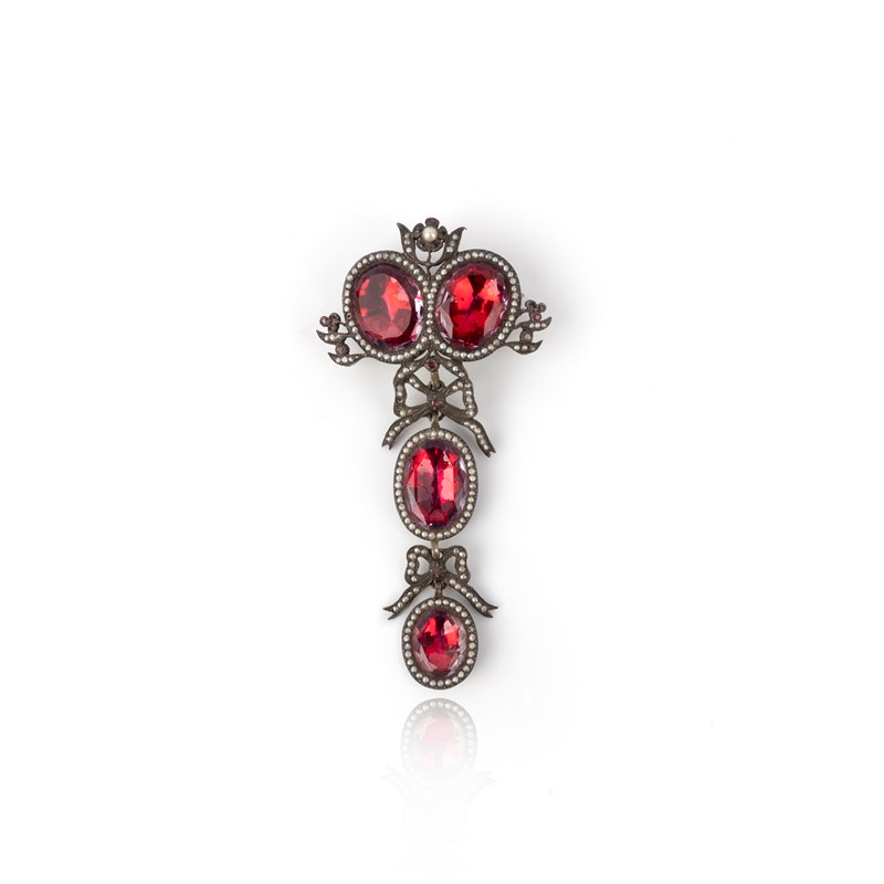 A red paste and seed pearl brooch, 18th century, set with two oval red pastes within seed pearl frames, accented with floral motifs, suspending two pendants, similarly set and spaced by bow motifs, mounted in silver, length 8cm, brooch fitting with French assay mark and maker's mark, pearls untested