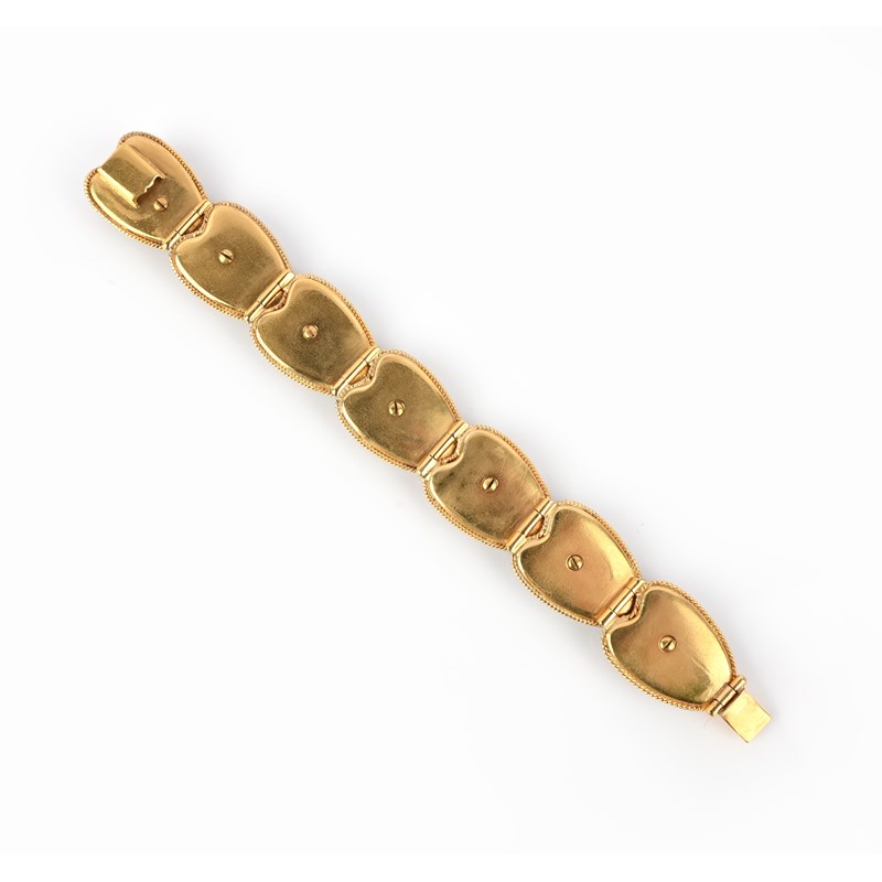 An unusual Bog Oak and gilt metal bracelet, third quarter 19th century, composed of links set with moulded bog oak fox faces, in gilt rope twist borders, length 17.5cm