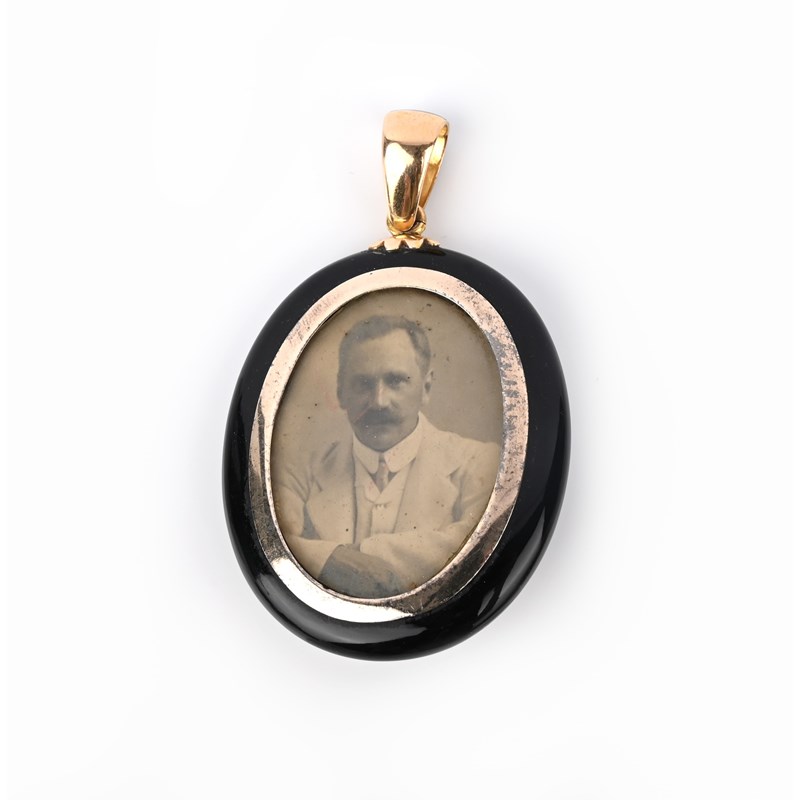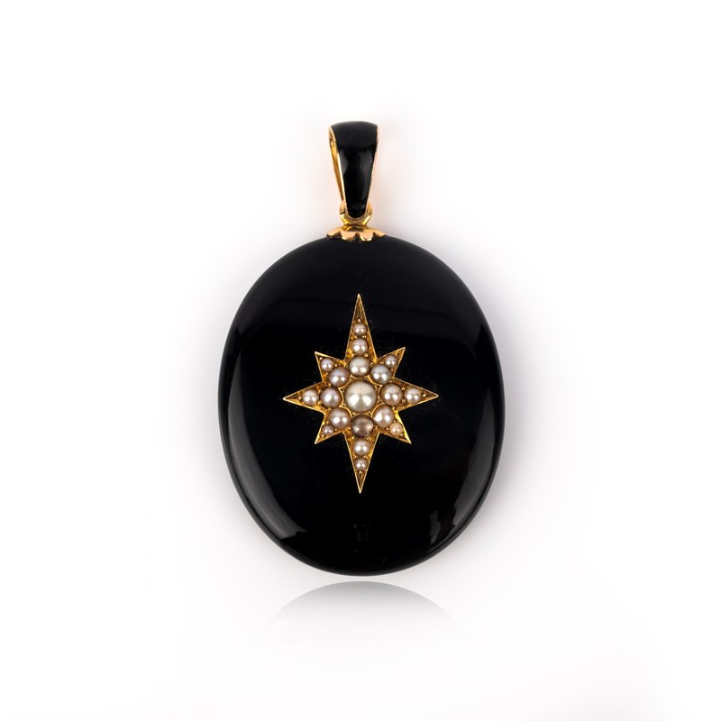 An enamel and pearl locket, late 19th century, of oval outline, the front and bail applied with black enamel, centring on a star motif set with half pearls, the reverse with a glazed compartment, containing a photograph, mounted in gold, length 6.8cm including bail, pearls untested, one pearl replaced with a simulant, fitted case stamped Folkard & Son, Brighton