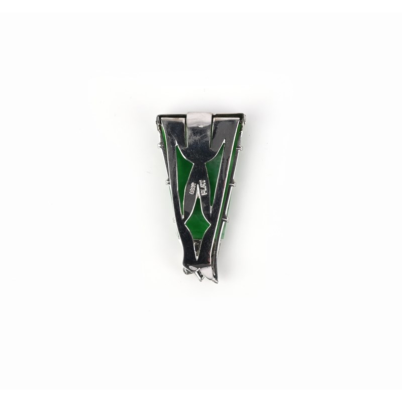 An Art Deco jadeite and diamond clip brooch, circa 1930, of triangular outline, set with a carved jadeite plaque, accented with single-cut diamonds in millegrain-bordered platinum, length 3.8cm, stamped 18CT PLAT