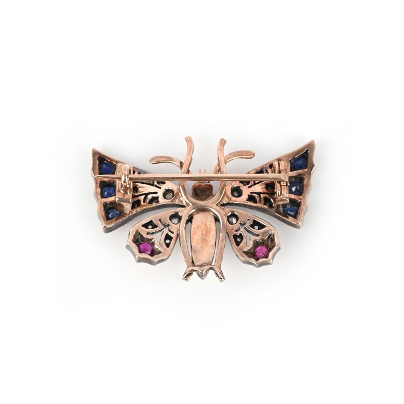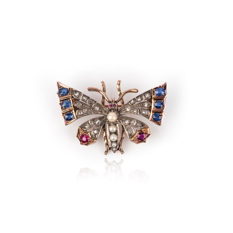 A gem-set brooch, late 19th century, designed as a butterfly, set with circular-cut sapphires and rubies, rose-cut diamonds and pearls, mounted in silver on gold, wingspan 3.6cm