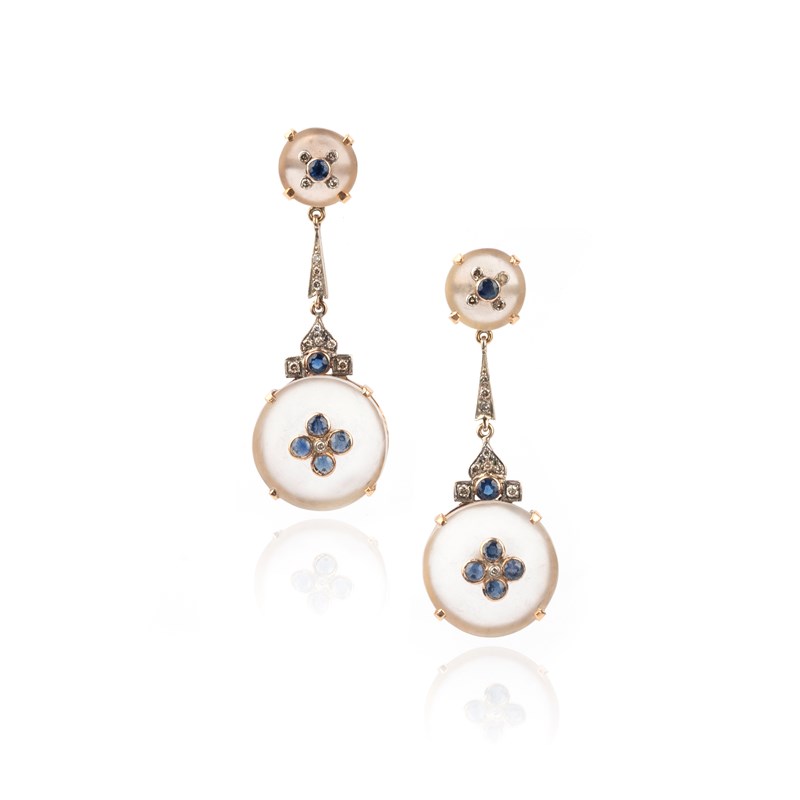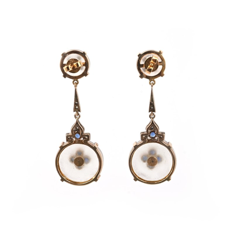 A pair of rock crystal, sapphire and diamond earrings, of pendent design, set with frosted rock crystal, circular-cut sapphires and brilliant-cut diamonds, mounted in silver and gold, length 5.7cm, post fittings