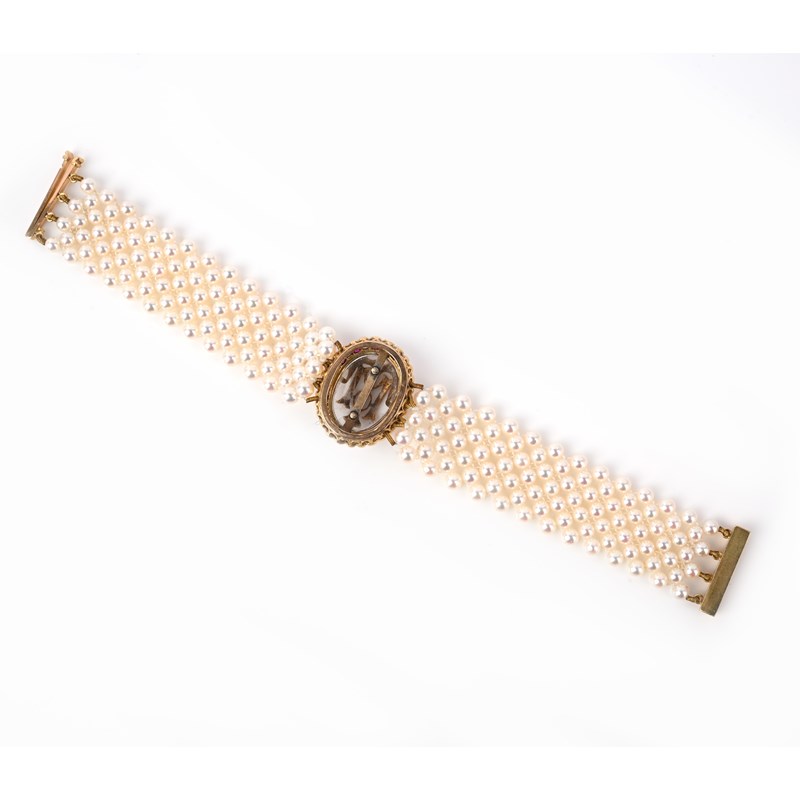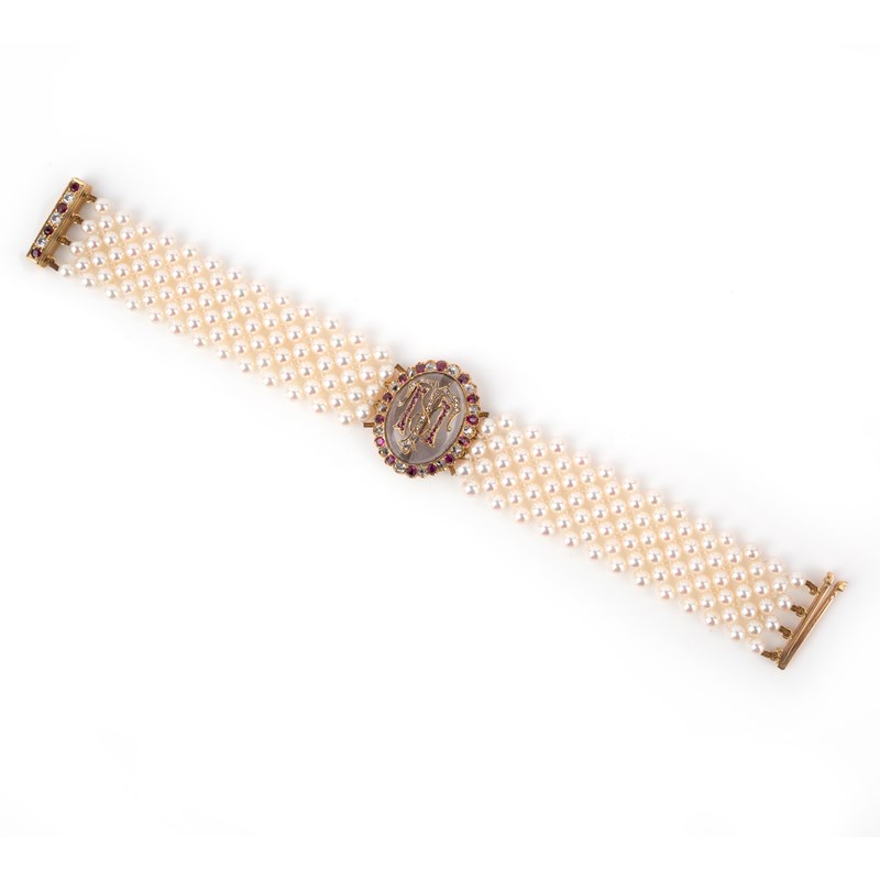A ruby, rock crystal, diamond and cultured pearl bracelet, 19th century and later, centring on an oval cabochon rock crystal inset with the initials TM set with rose-cut diamonds and rubies, within a border of cushion-shaped rubies and diamonds, mounted in gold, the clasp similarly set, to a later cultured pearl mesh bracelet, length 17.5cm