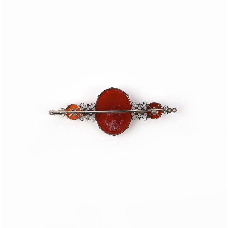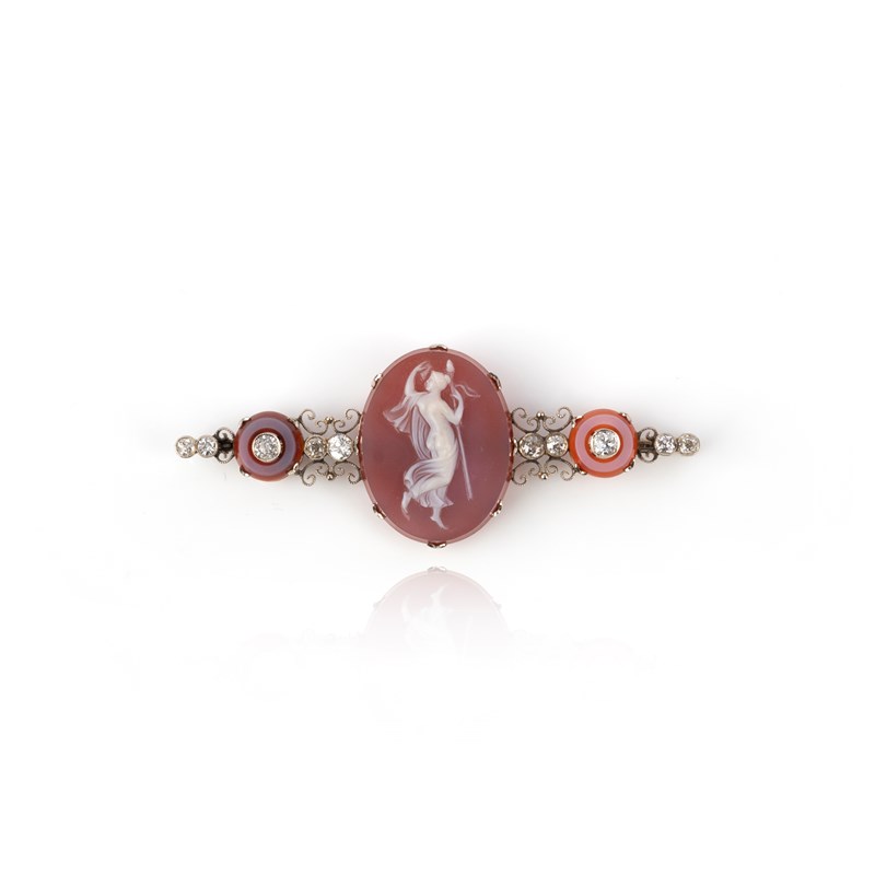 A sardonyx cameo and diamond brooch, early 20th century, centring on a cameo of a dancing Bacchante holding Bacchus' staff and a bunch of grapes, to a brooch of bar design with scrolled borders, set with cushion-shaped diamonds and two annular sections of sardonyx, mounted in gold, length 7.5cm, cameo 3.4 x 2.2cm