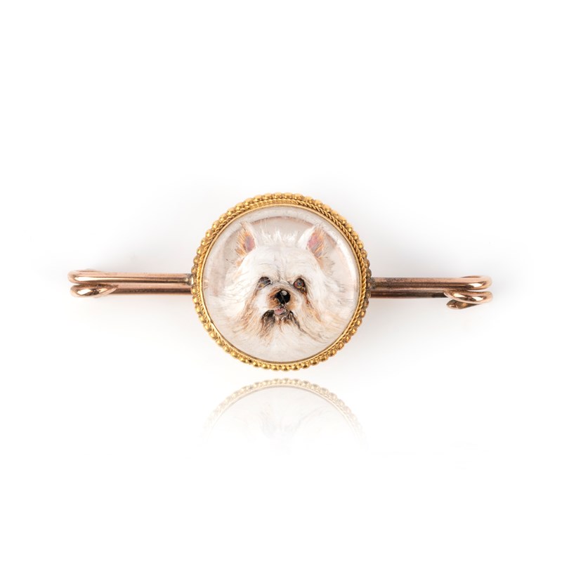 A reverse-carved rock crystal intaglio brooch, late 19th century, centring on a rock crystal cabochon carved to the reverse with a painted intaglio of a Maltese terrier, within a gilt frame, to a later gold bar brooch, length 5cm