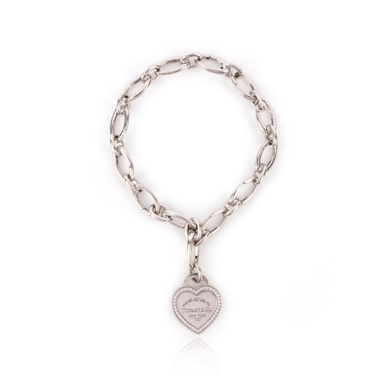 Tiffany & Co., a white gold and diamond bracelet, the oval link bracelet suspending a heart charm set with brilliant-cut diamonds, inscribed 'Please return to Tiffany & Co. New York', length 18cm, charm length 2cm, stamped 750, bracelet and pendant signed T&Co.