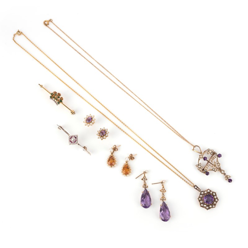 A group of jewellery, early 20th century, comprising: two amethyst and seed pearl pendants, lengths 5.2cm and 3cm, chain lengths 42cm and 51cm; two pairs of amethyst and seed pearl earrings, post fittings, length 4.3cm and 1.3cm; a pair of citrine and seed pearl earrings, post fittings, length 2.7cm each; a bar brooch set with a converted square cufflink applied with white enamel and set with rubies and diamonds, length 4.7cm, dated 1925; and an enamel bar brooch, length 5.1cm, British hallmarks for 9ct gold, all mounted in gold, pearls untested
