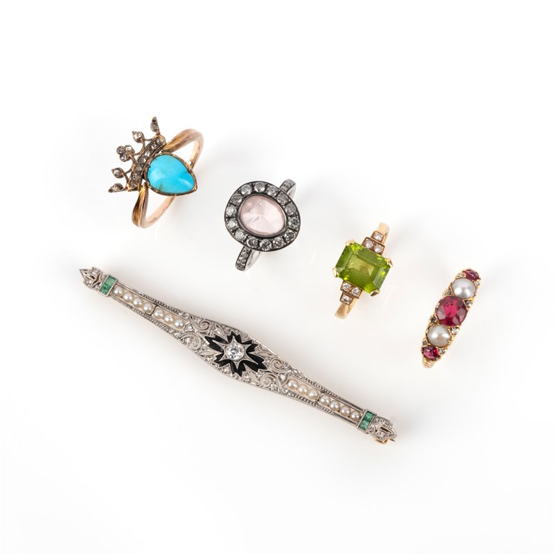 A mixed group of jewellery, including a doublet and pearl half hoop gold ring, size N 1/2, a white stone and diamond cluster ring, size K 1/2, a peridot and diamond-set gold ring, size M 1/2, a turquoise and diamond-set gold ring, size P and an early 20th century gem-set brooch in platinum and gold, width 7cm, case