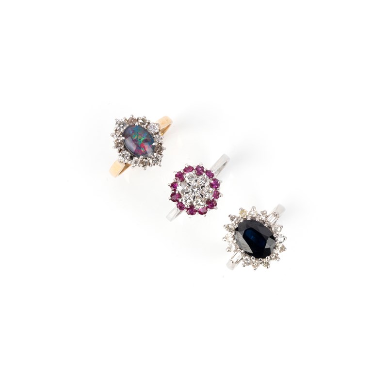 A collection of three rings, comprising: a ring designed as a cluster of brilliant-cut diamonds and circular-cut rubies, mounted in white gold, size P, stamped 18CT, case; a ring set with an oval sapphire within a border of single-cut and baguette diamonds, mounted in white gold, size M1/2, case; and ring set with an opal triplet within a border of single- and circular-cut diamonds, mounted in gold, size O, case