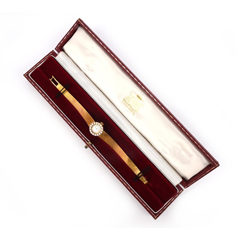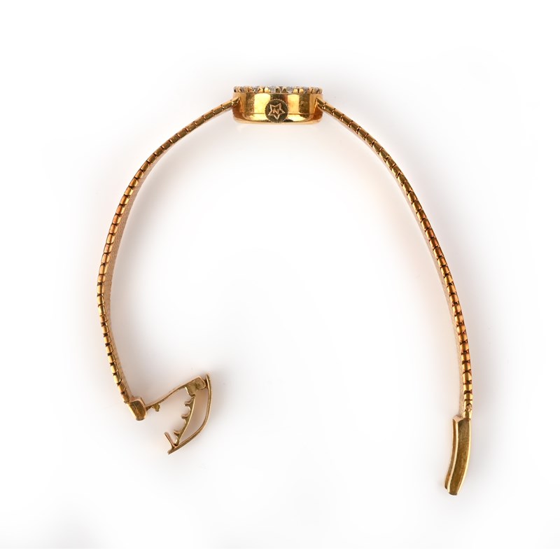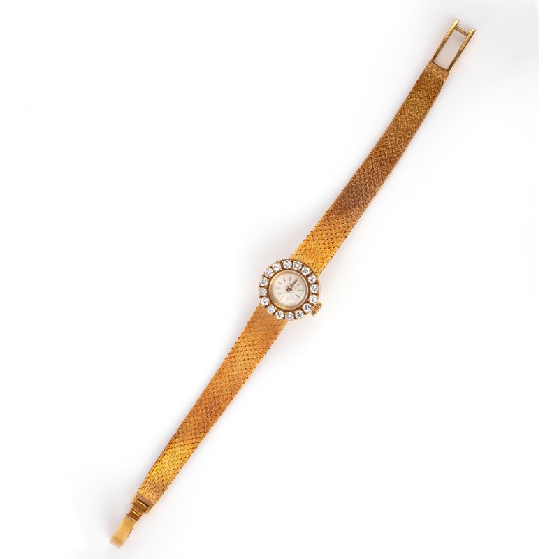 Zenith, a ladies gold and diamond wristwatch, signed dial with baton numerals, manual winding, with diamond-set bezel, case numbered 070121 on 18ct gold bracelet, London import marks for 1967, case 11mm wide, length 15.5cm, case