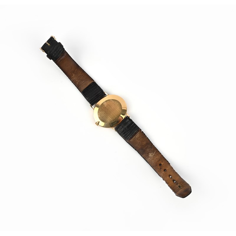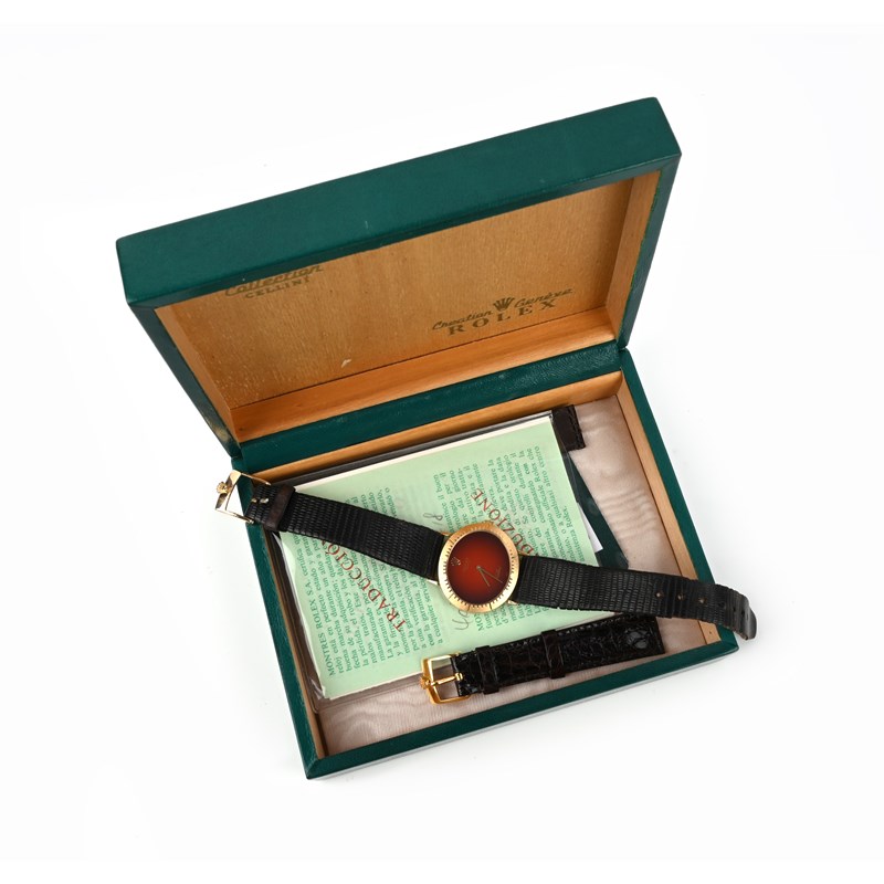 Rolex, a gold Cellini wristwatch, the oval red enamelled dial with gold hands, within a gold bezel with incised baton indicators, to a leather strap, manual winding movement, dial and strap signed Rolex, case back numbered 4083, 4364418, Swiss and European convention assay marks for 18ct gold, stamped 18K, original box and papers