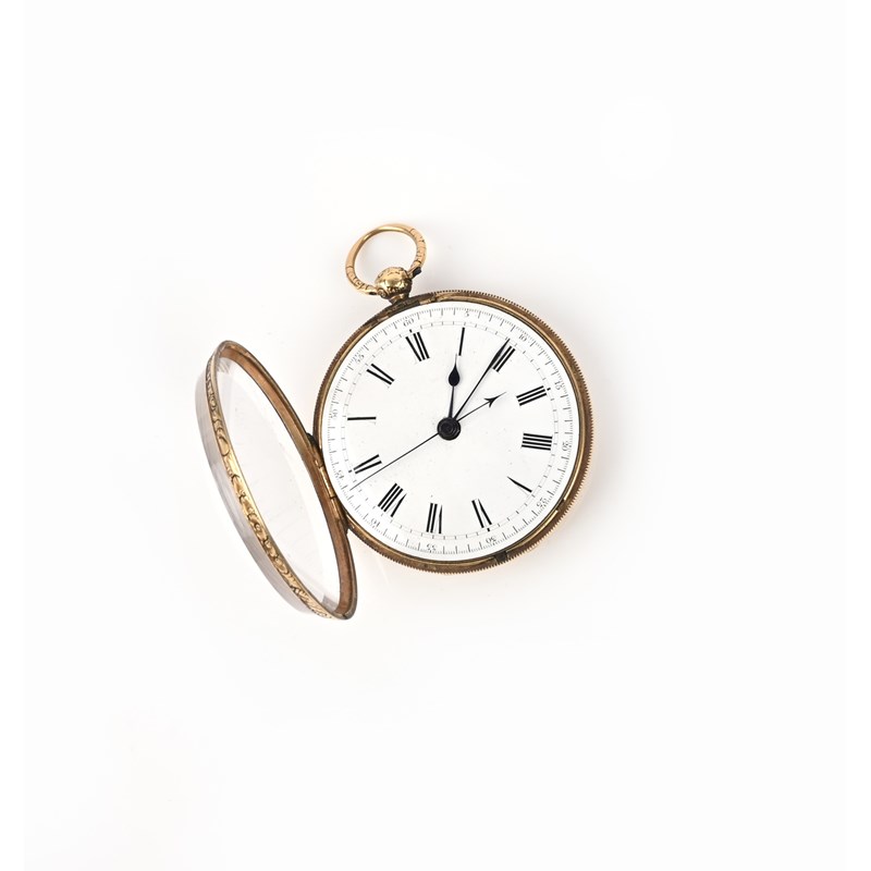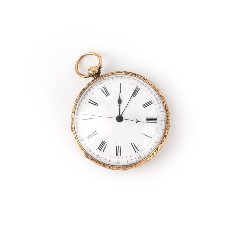 A gold pocket watch, circa 1844, the white enamel dial with Roman numeral indicators and blued steel hands, to a gold case with an engraved floral border, the reverse with engine turned decoration, length 6.6cm including suspension hoop, British hallmarks for 18ct gold, Chester, 1844, winding keys deficient
