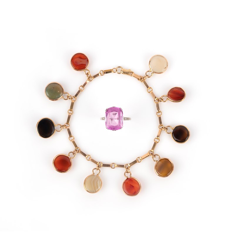 A gold and hardstone bracelet, mid 19th century, and a synthetic pink sapphire and diamond ring, early 20th century, the gold bracelet suspending a series of spectacle-set polished hardstones, length 19.2cm, later clasp; together with ring set with a cushion-shaped synthetic pink sapphire between single-cut diamond shoulders, mounted in platinum, size L1/2