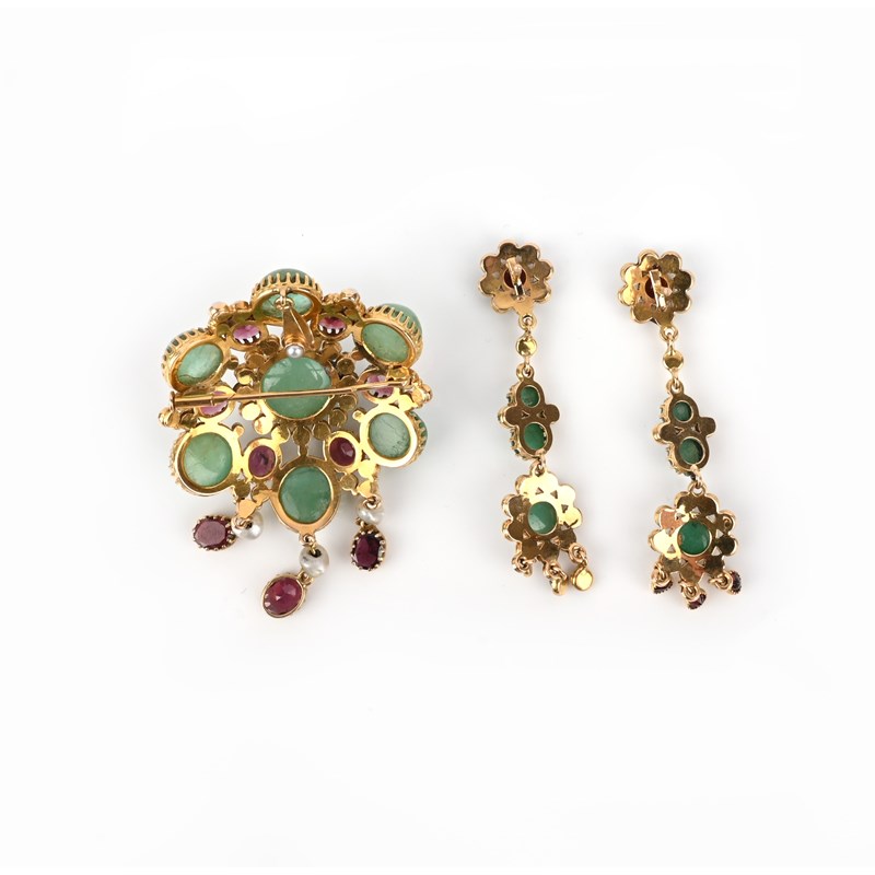 An emerald, garnet and pearl demi-parure