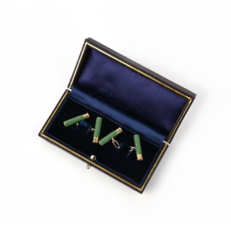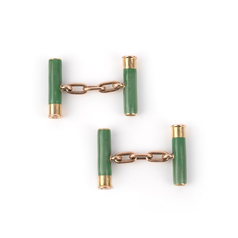 A Victorian pair of enamel cufflinks, late 19th century, designed as shotgun cartridges, applied with green enamel, mounted in gold, length 2cm at each end