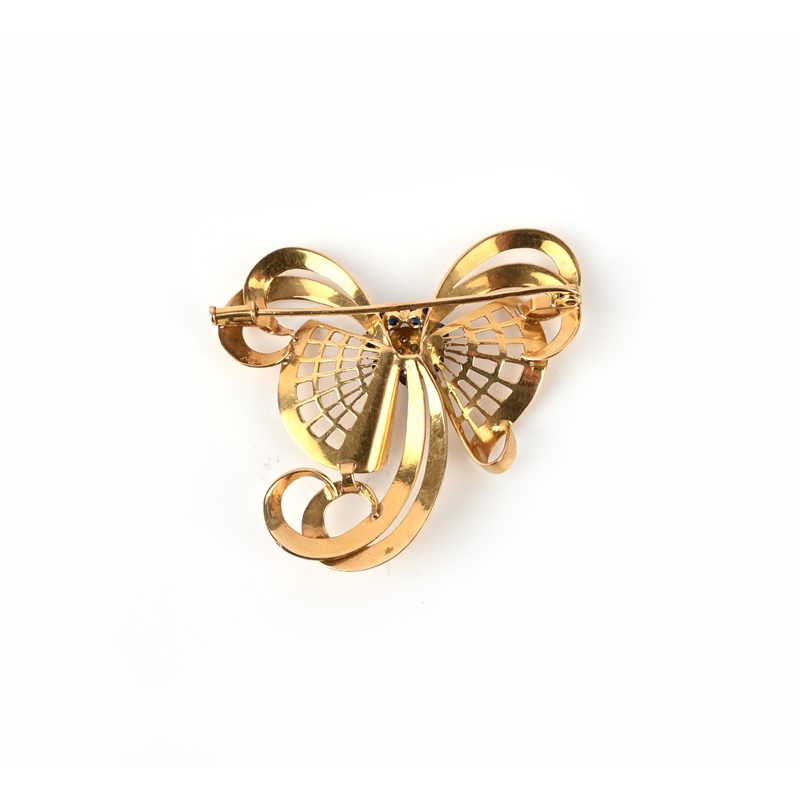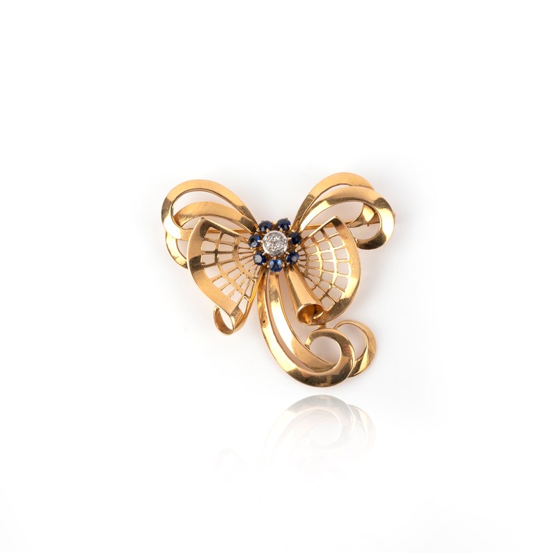 A Retro gold, sapphire and diamond brooch, 1940s, designed as an abstract ribbon bow in gold, the centre set with single-cut diamonds and circular-cut sapphires, length 5.5cm, French assay marks for 18ct gold and platinum, French maker's mark RN with a flower