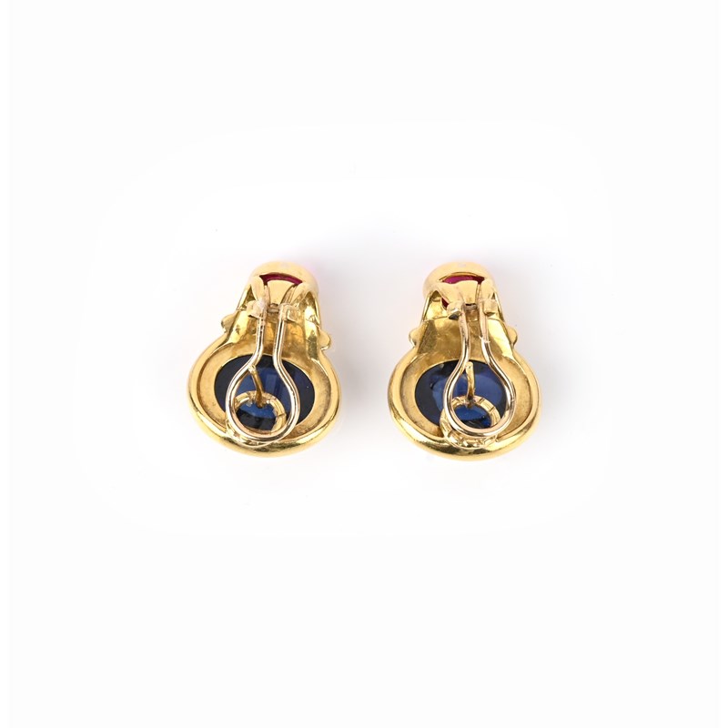 A pair of synthetic gem-set gold earrings, set with a cabochon blue and red stone in polished yellow gold, post and clip fittings, 2.5cm, case