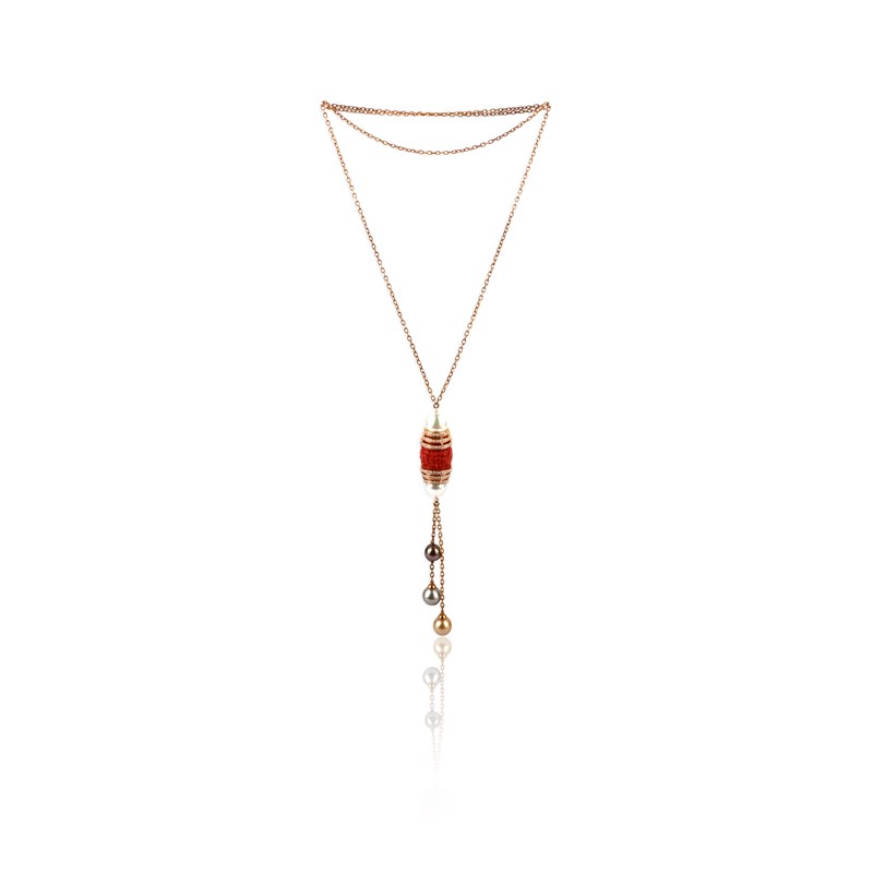 λ A coral, cultured pearl and diamond sautoir pendant, the pendant composed of a coral bead carved with Chinese dragons, capped at each end with graduated rings of pavé-set brilliant-cut diamonds and terminating in bouton-shaped cultured pearls, suspending two further cultured pearl pendants, to a gold rope-twist belcher link chain necklace, chain length 91cm, pendant length 15.6cm