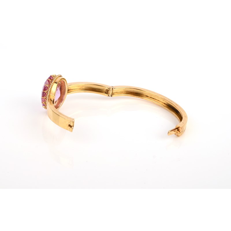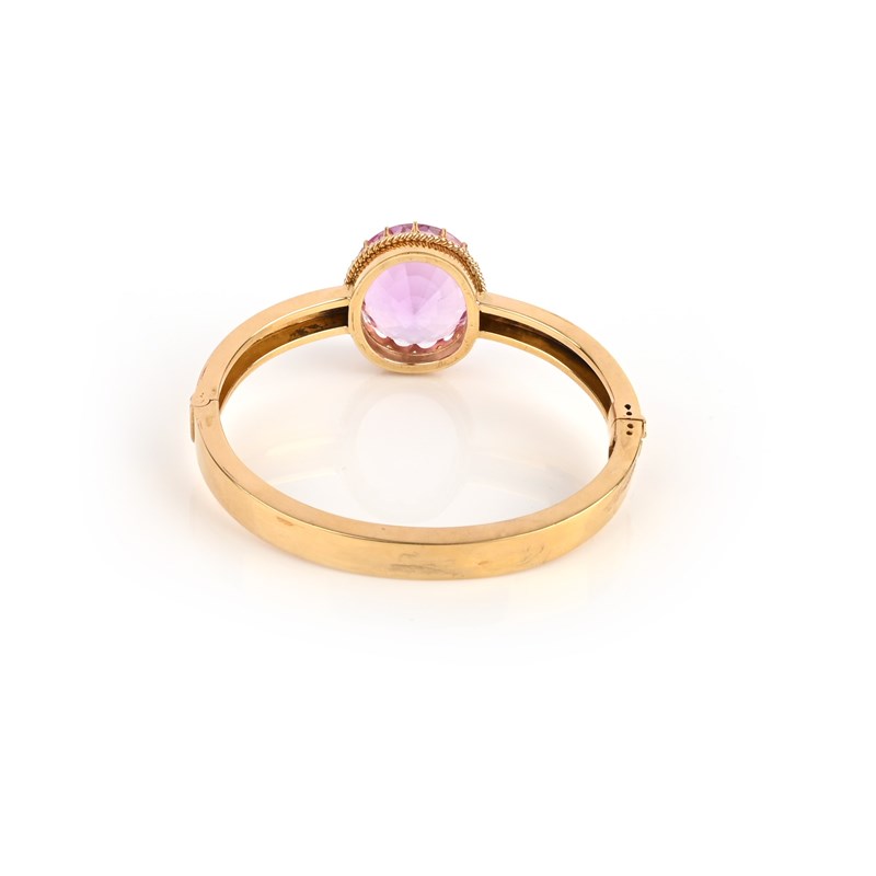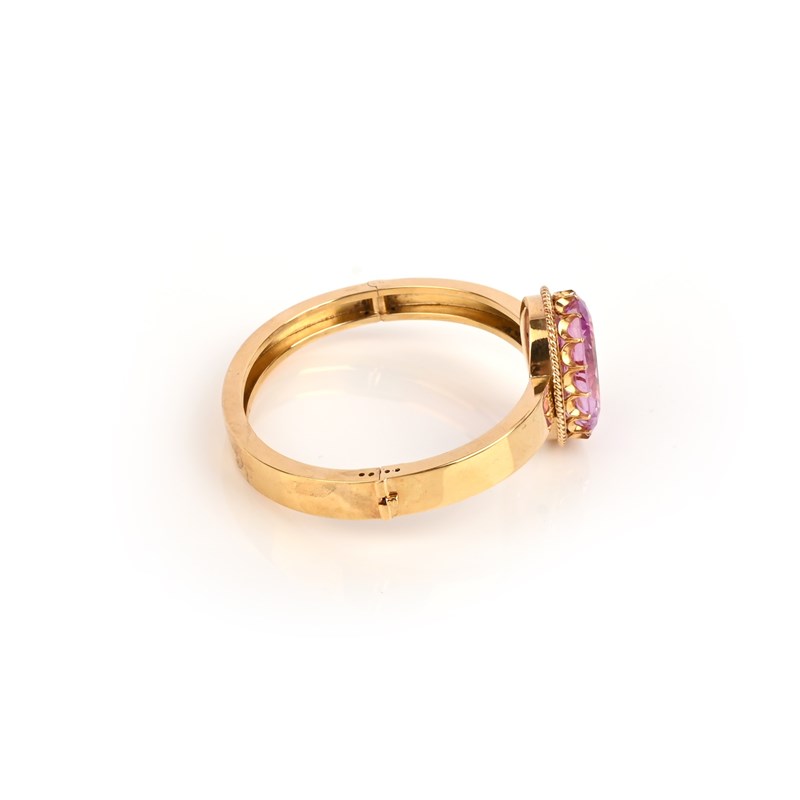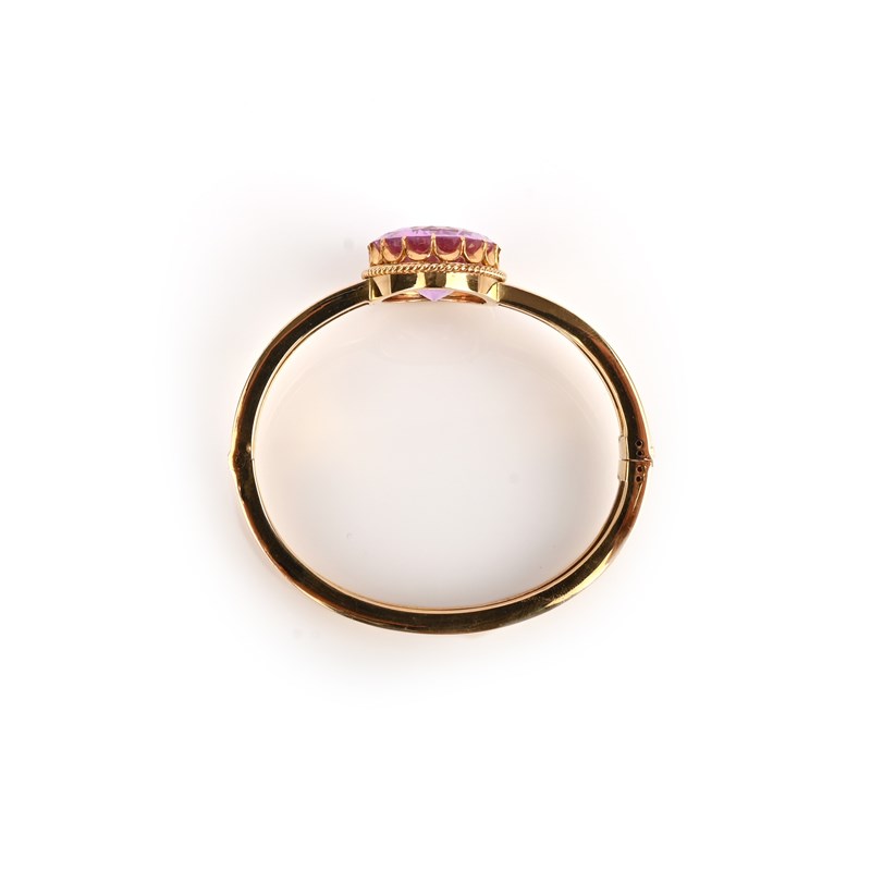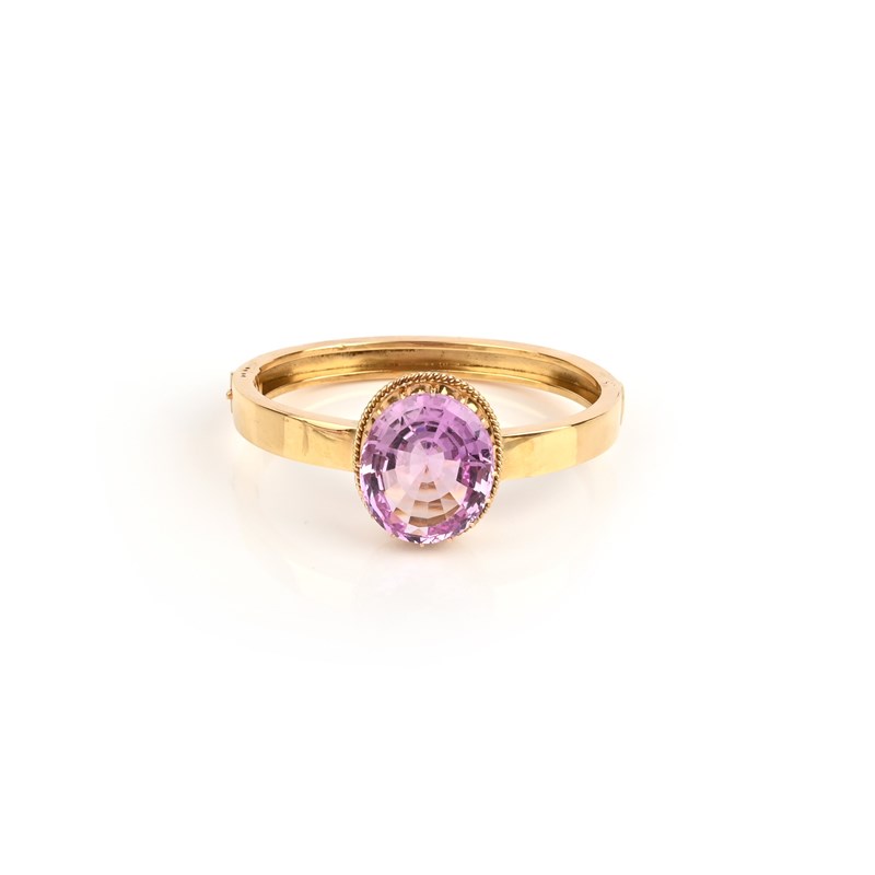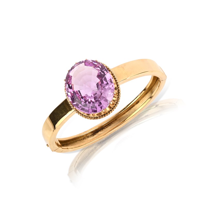 A pink topaz and gold bangle, late 19th century, the hinged bangle set with a large oval pink topaz weighing 34.90 carats, inner circumference 16cm