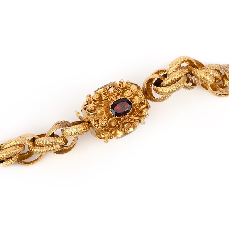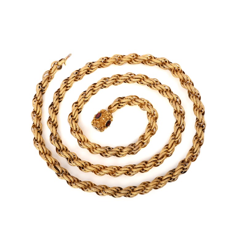 A gold and garnet muff chain necklace, 1830s, composed of stamped gold links connected in a spiral arrangement, to a cylindrical clasp with gold filigree decoration set with foil-backed oval garnets, length 120cm, case stamped Cameo Corner