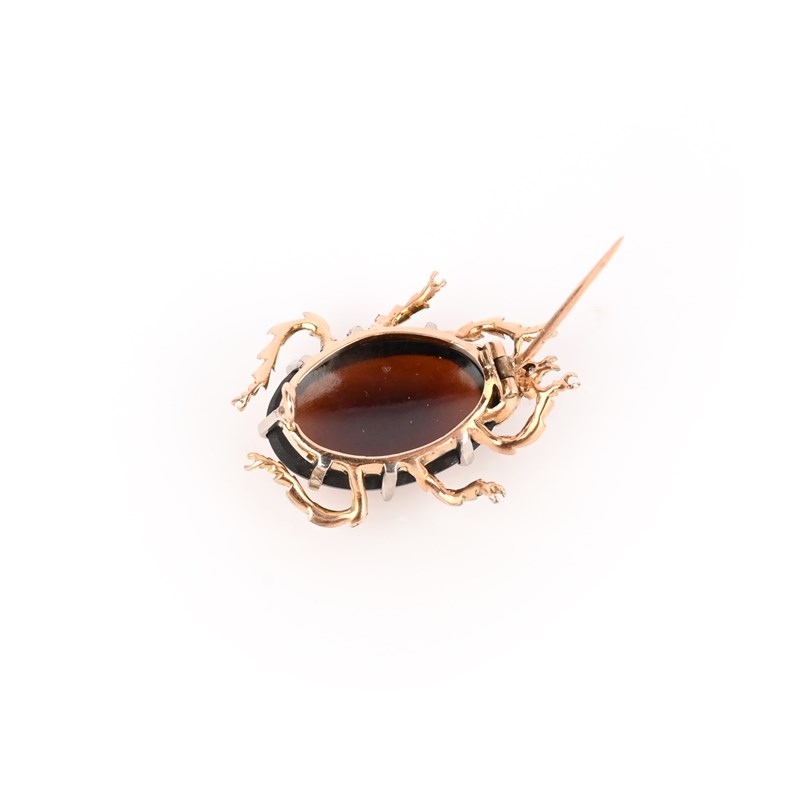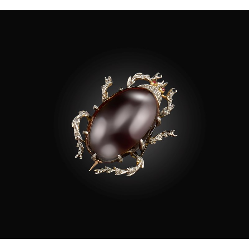 An early 20th century gem-set beetle brooch, the body formed from an oval cabochon garnet, with garnet cabochon eyes and diamond-set legs in platinum and gold, 3.4cm longest