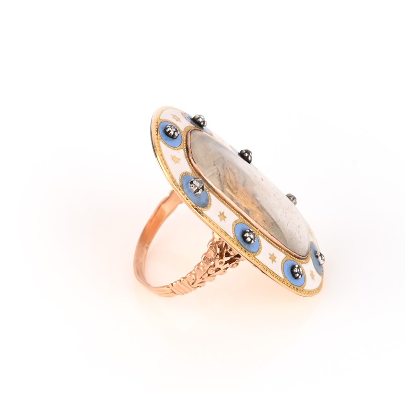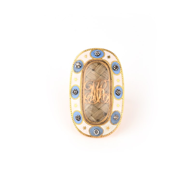 A gold, enamel and diamond mourning ring, late 18th century, the oval ring centred on a glazed panel of woven hair work with conjoined gold initials, possibly MR, within a white and blue enamel border accented with rose-cut diamonds, to a ring with pierced foliate shoulders, size Q, possibly converted from a brooch or slide
