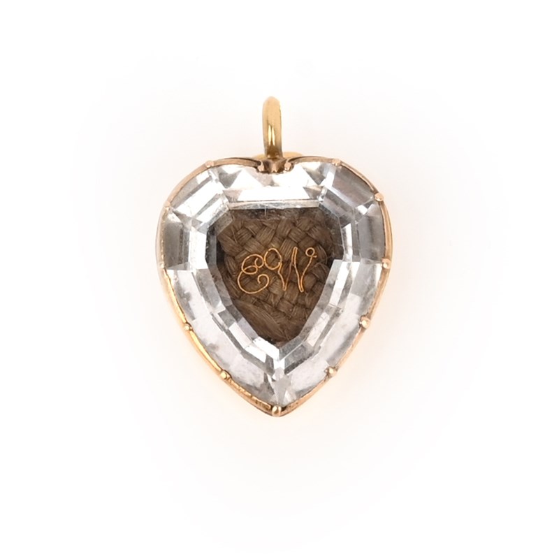 A rock crystal mourning pendant, 19th century, the heart-shaped gold locket set with a faceted rock crystal, over a panel of hairwork with the initials EW in gold thread, length 3cm including bail