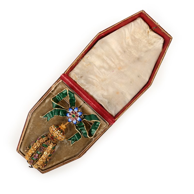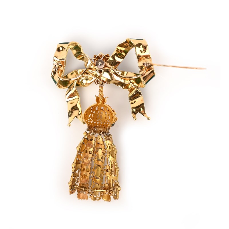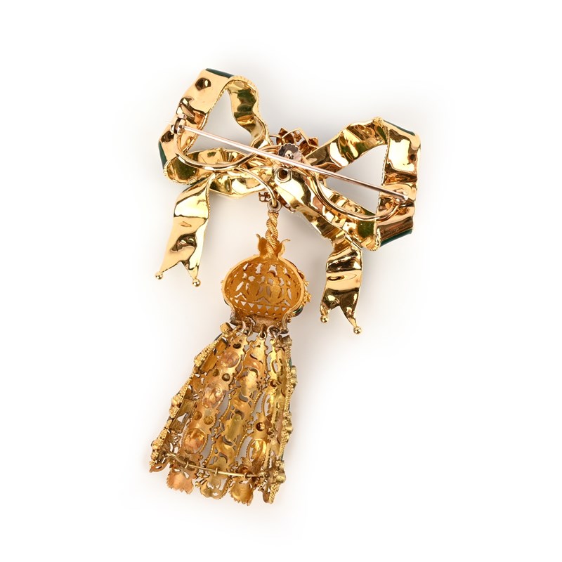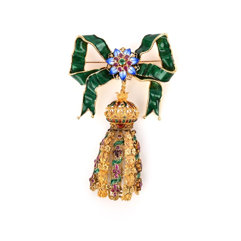 A Regency gold tassel pendant, decorated with polychrome enamel and ruby quatrefoils in pierced canetille surround, suspending from a later green enamel bow, set with a ruby, emerald and blue enamel flower centrepiece in yellow gold, 10cm high, case