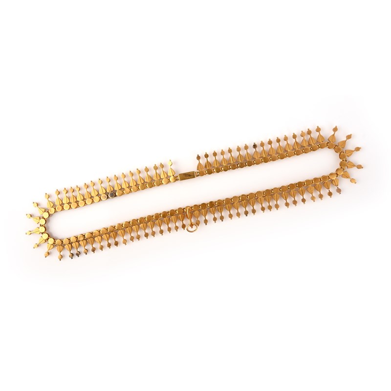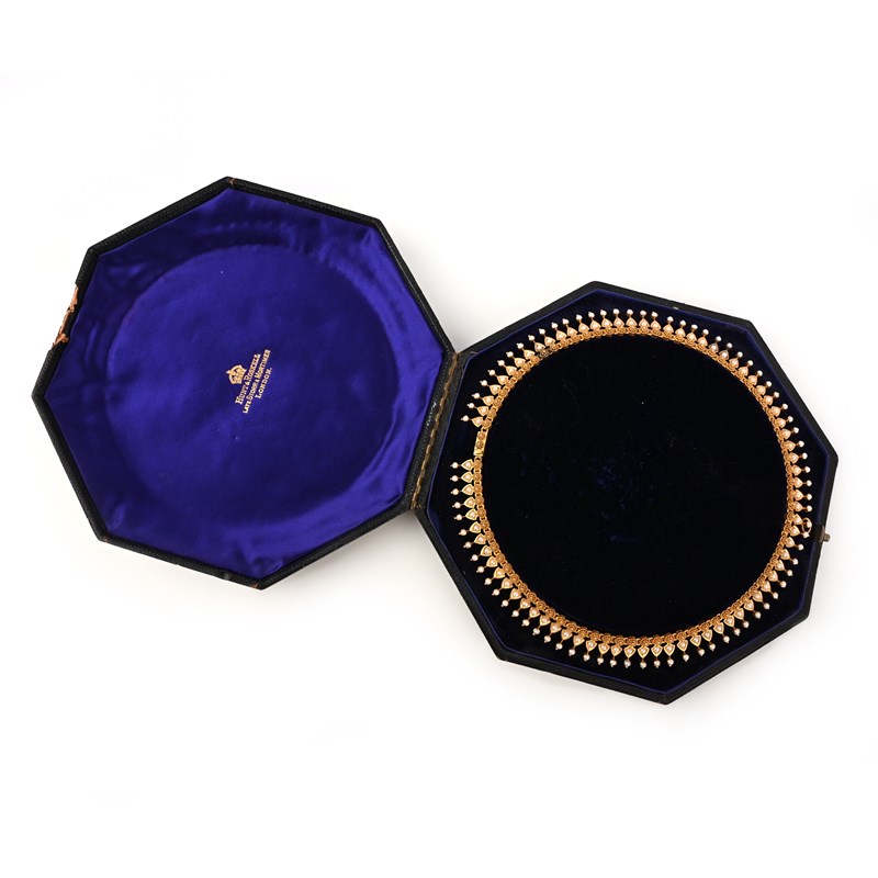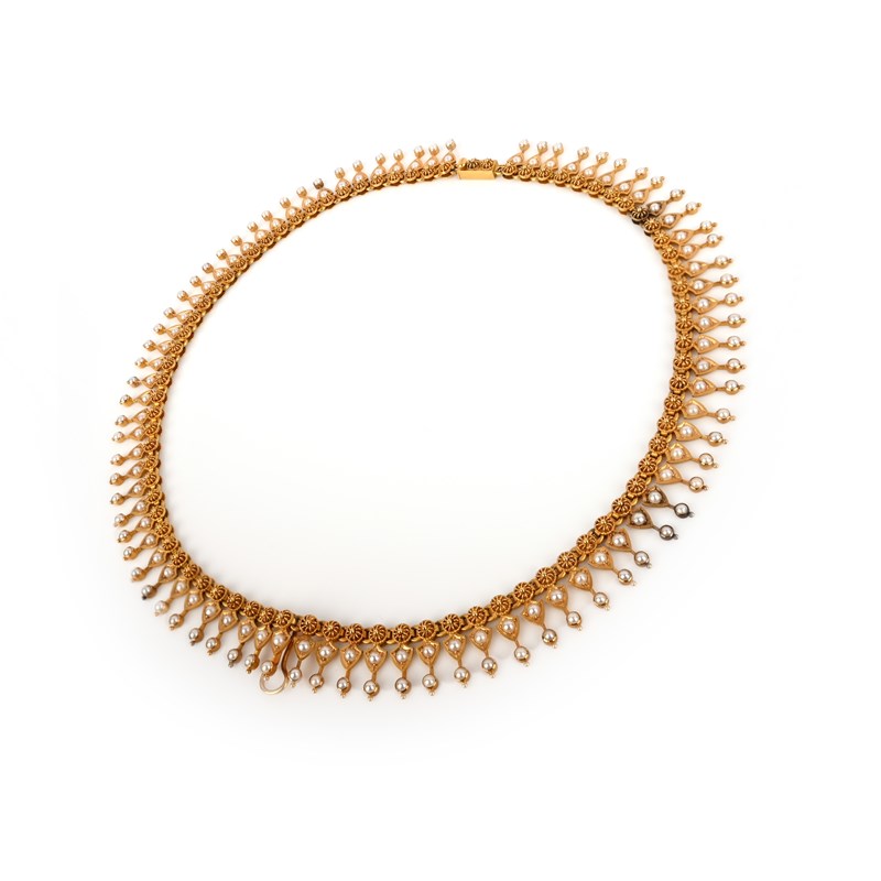 A Victorian pearl-set gold collar necklace, the fringe formed from small cannetille discs each suspending two seed pearls in yellow gold, the centre with a suspension loop, 42cm long, case by Hunt & Roskell