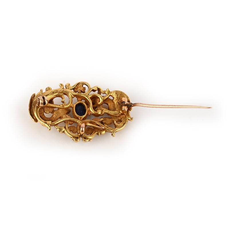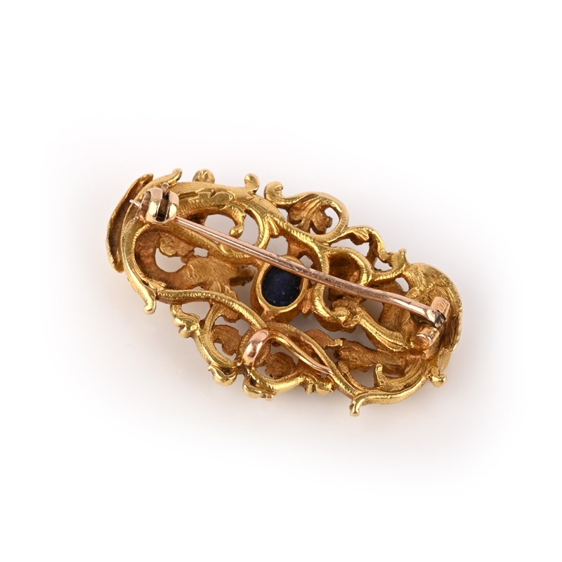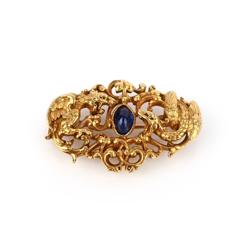 A late 19th century sapphire brooch, the stylised griffin and winged serpent fighting over a cabochon sapphire, within pierced scrolling yellow gold surround, 4cm wide