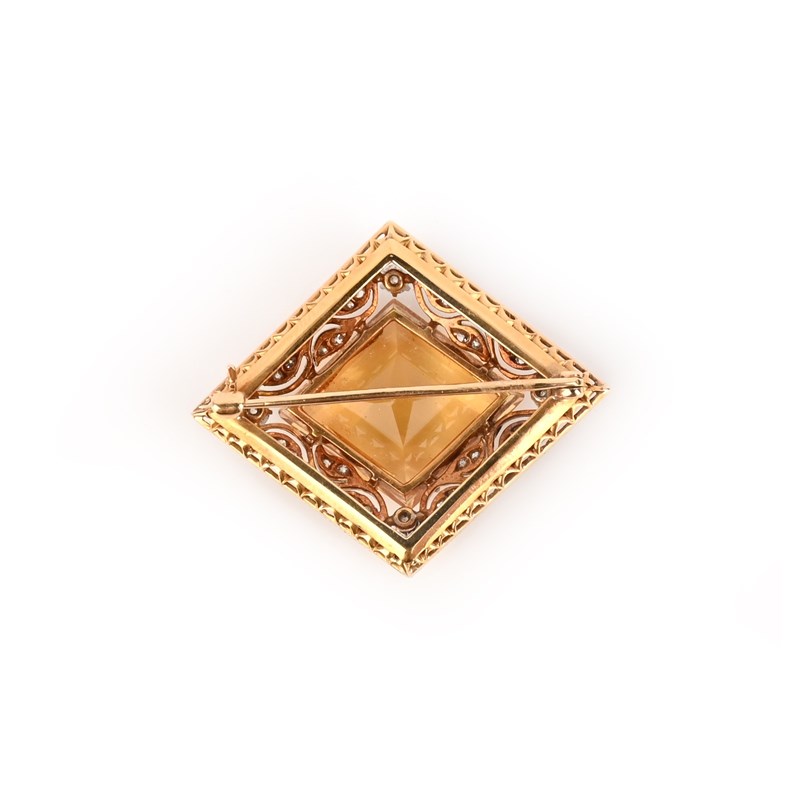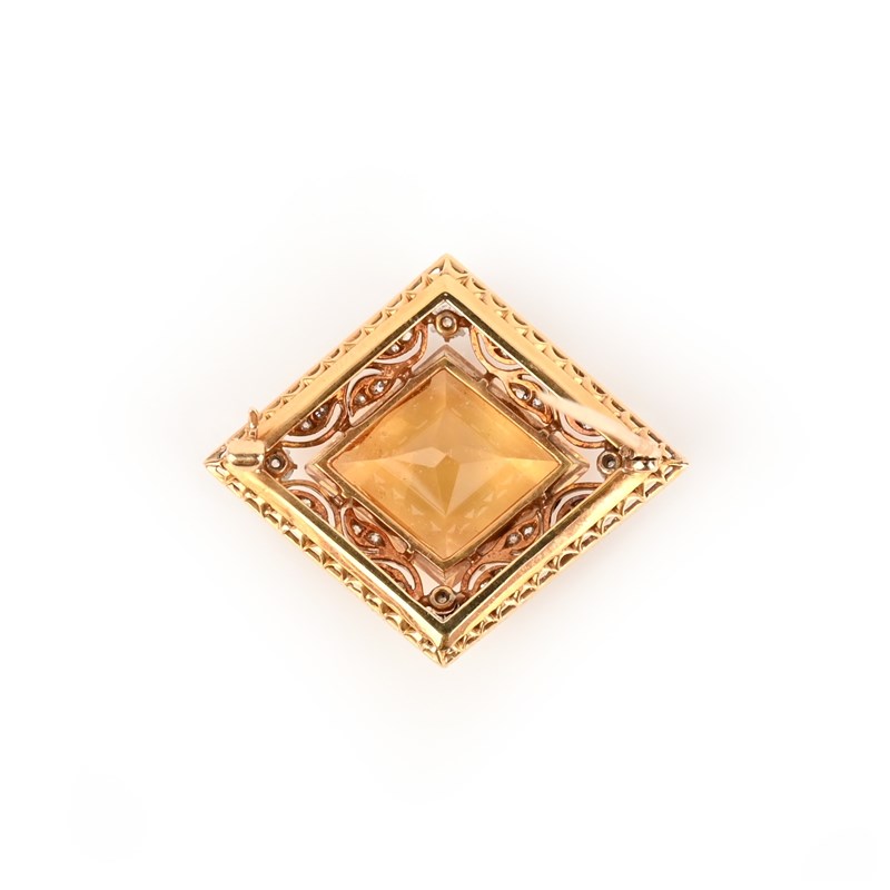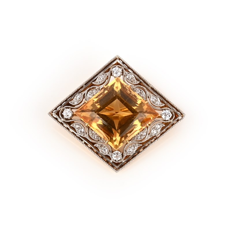 An Edwardian citrine and diamond brooch, set with a central citrine within millegrain-set diamond laurel border in platinum and gold, 4.1cm widest