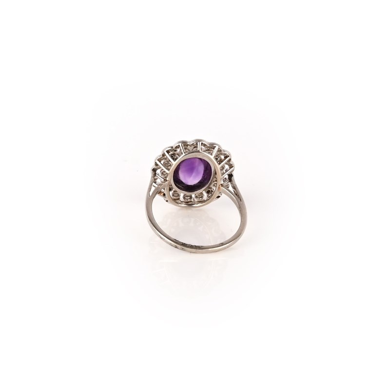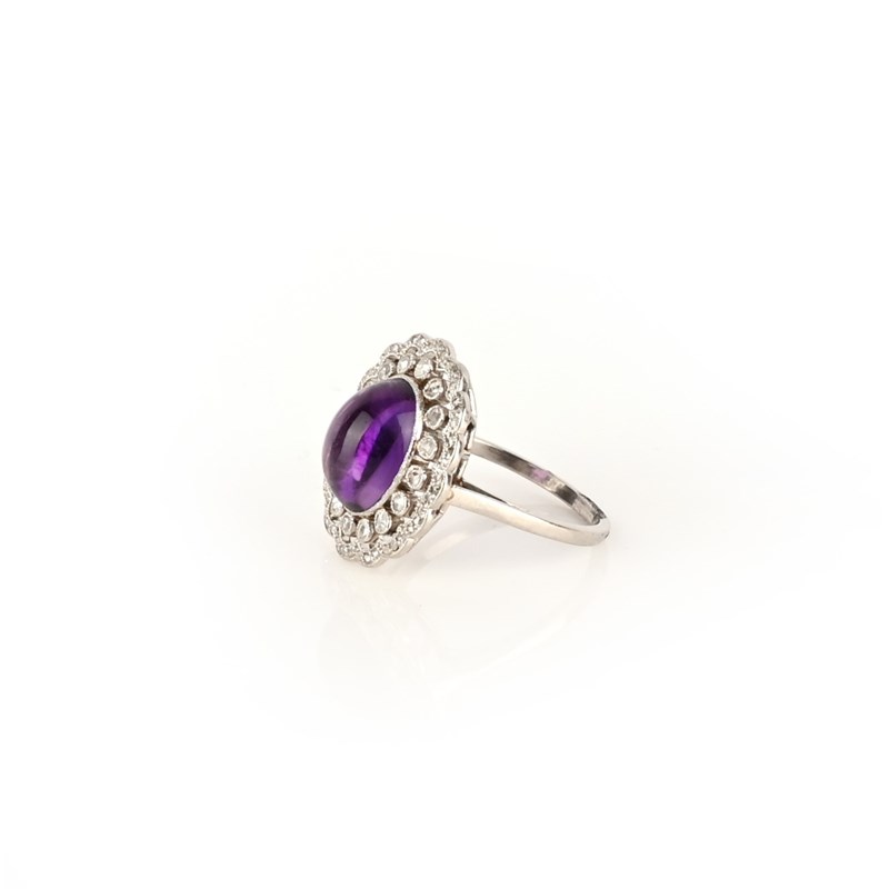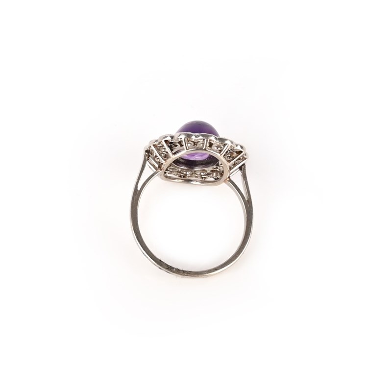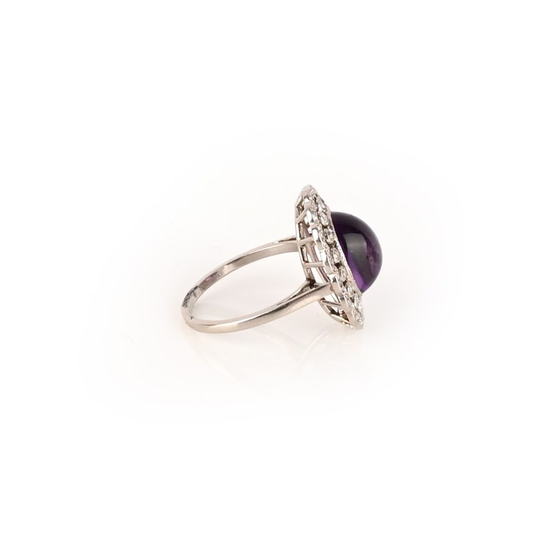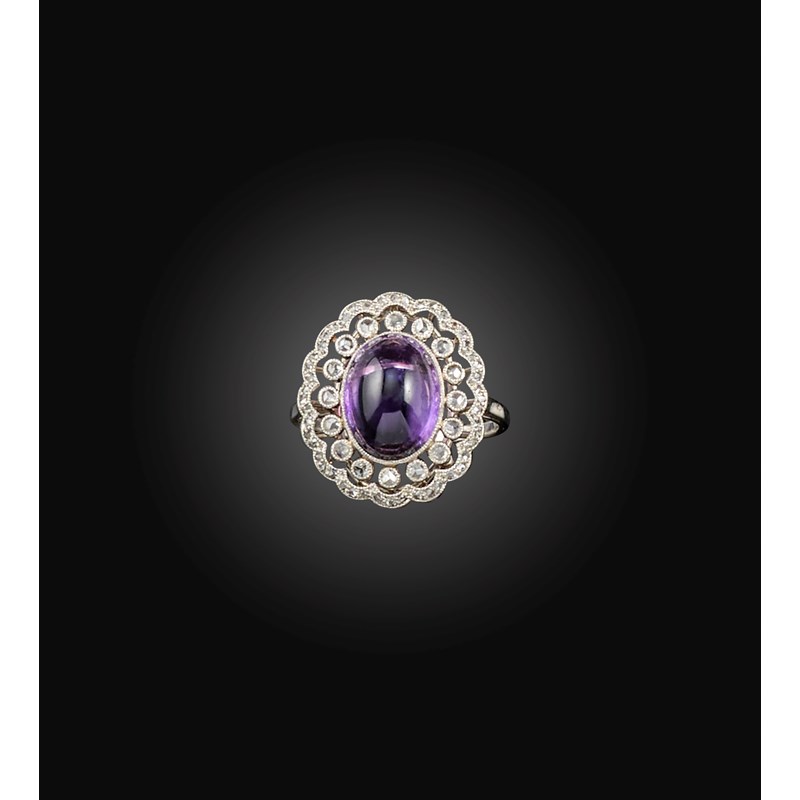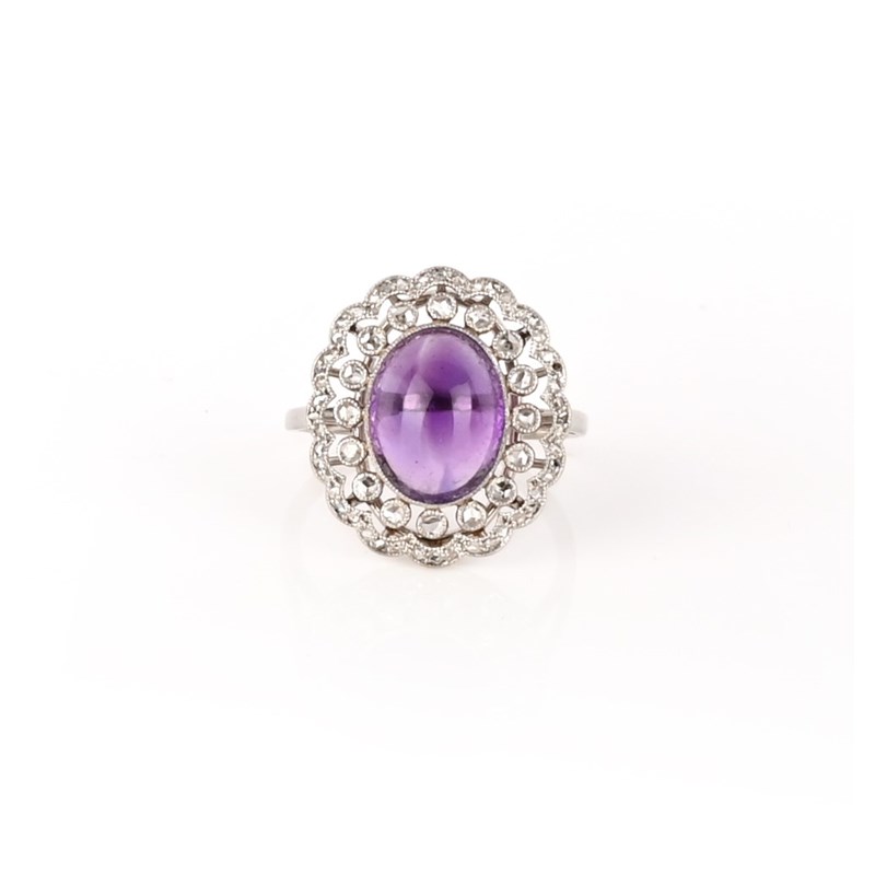 An amethyst and diamond ring, early 20th century, designed as a cabochon amethyst within an open work millegrain-borderd cluster set with rose-cut diamonds, mounted in platinum, size M1/2