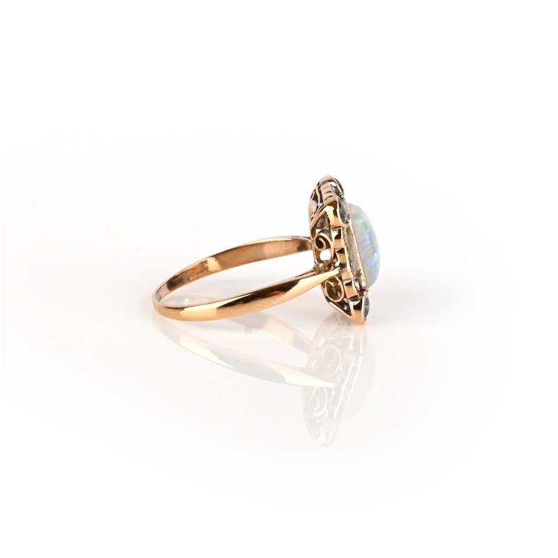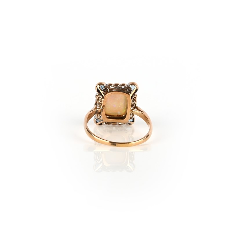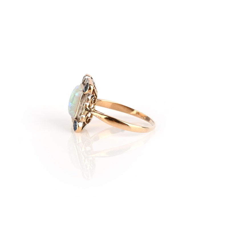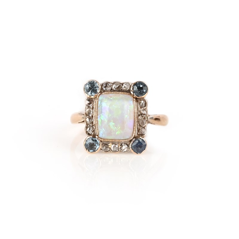 An opal, aquamarine and diamond ring, early 20th century, designed as a cluster, set with a rectangular sugarloaf cabochon opal within a border of rose-cut diamonds, the corners accented by circular-cut aquamarines, mounted in gold, size L1/2