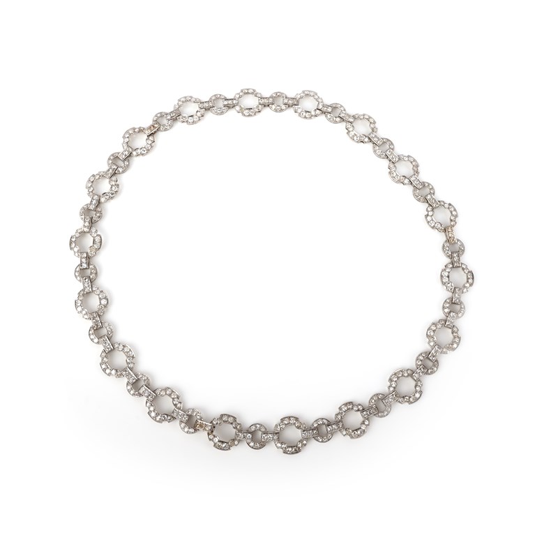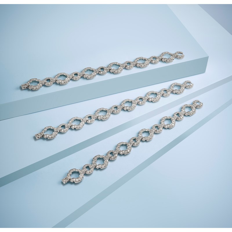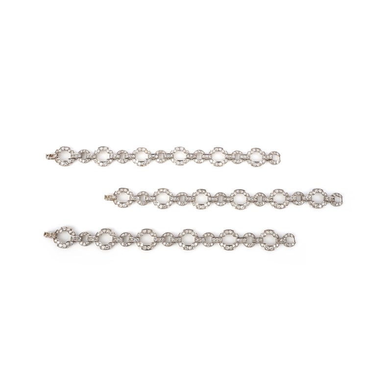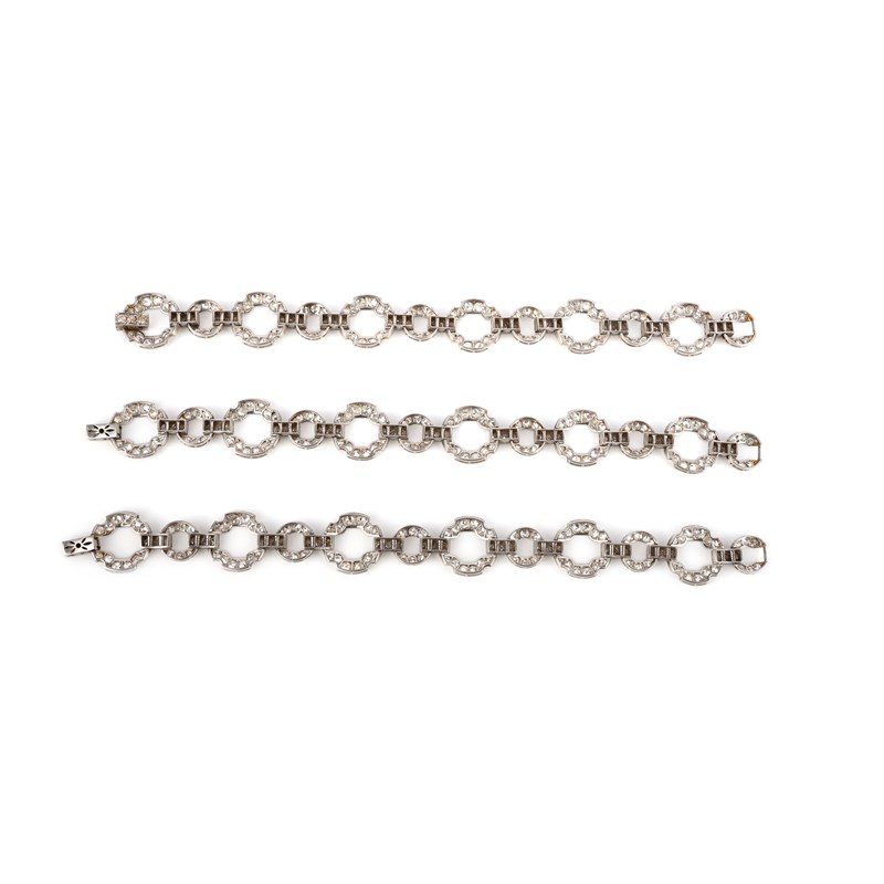 Three Art Deco diamond bracelets, the undulating circular links millegrain-set with graduated old circular-cut diamonds in platinum, the three bracelets joining to become one long necklace, each bracelet 19cm long, necklace 57cm long