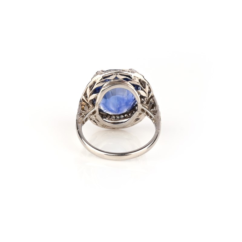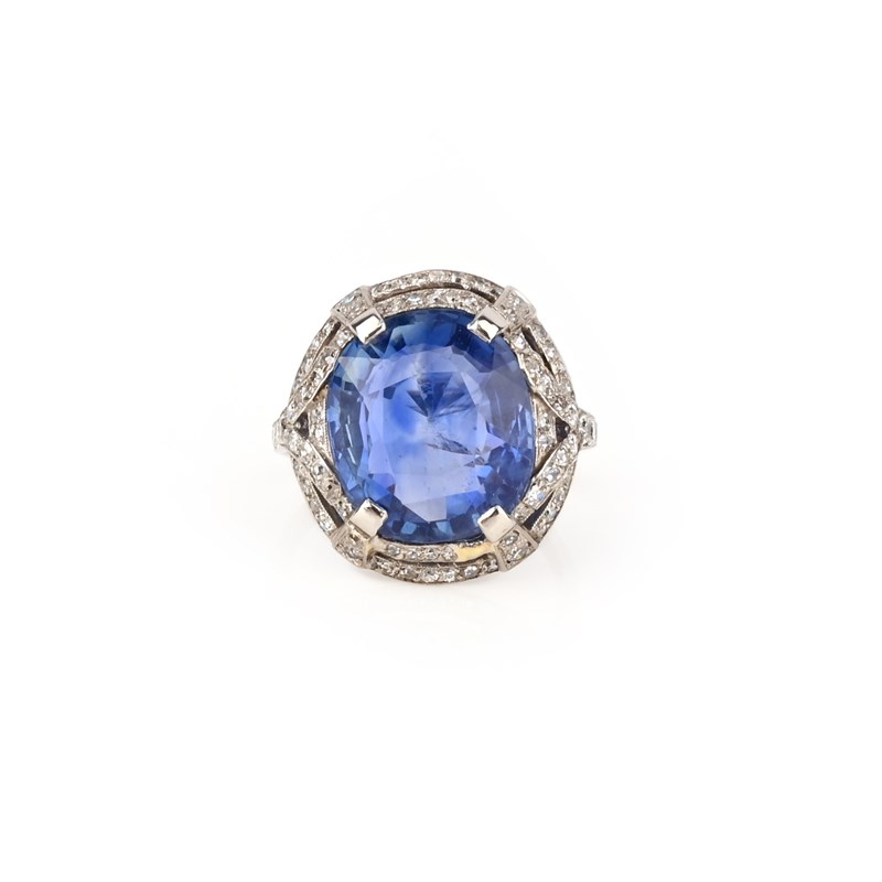 A sapphire and diamond ring, 1920s, claw-set with an oval sapphire weighing 12.97 carats, within a mount of ribbon design set with circular- and single-cut diamonds, the underside pierced with floral motifs, size M 1/2, stamped PLAT