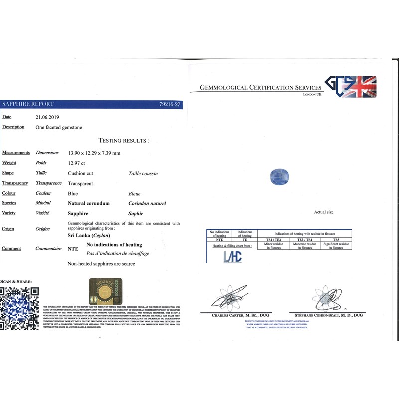 Accompanied by report number 79216-27 dated 21 June 2019 from GCS stating that the cushion-cut sapphire weighs 12.97cts and is a natural sapphire with no indications of heat treatment. Origin: Sri Lanka (Ceylon)
