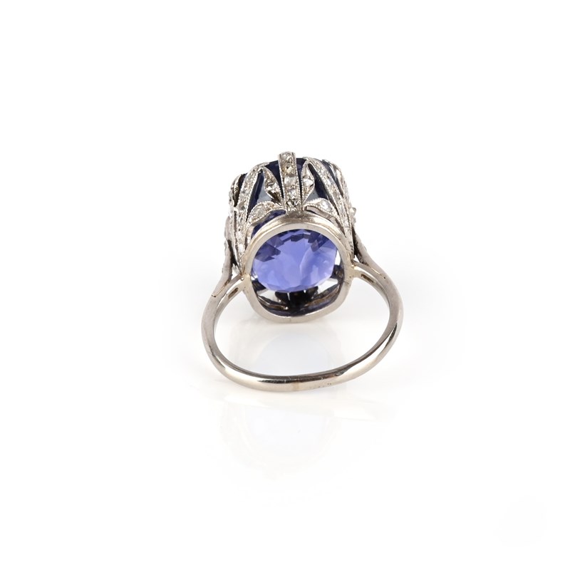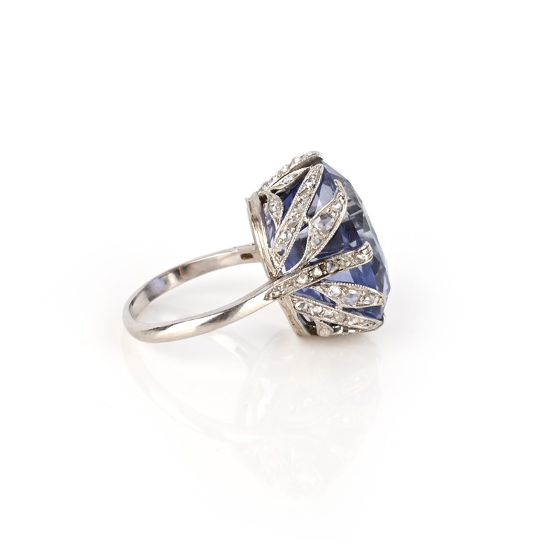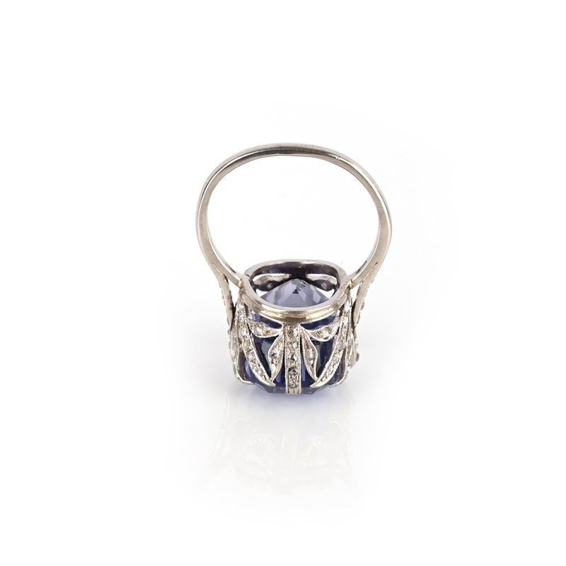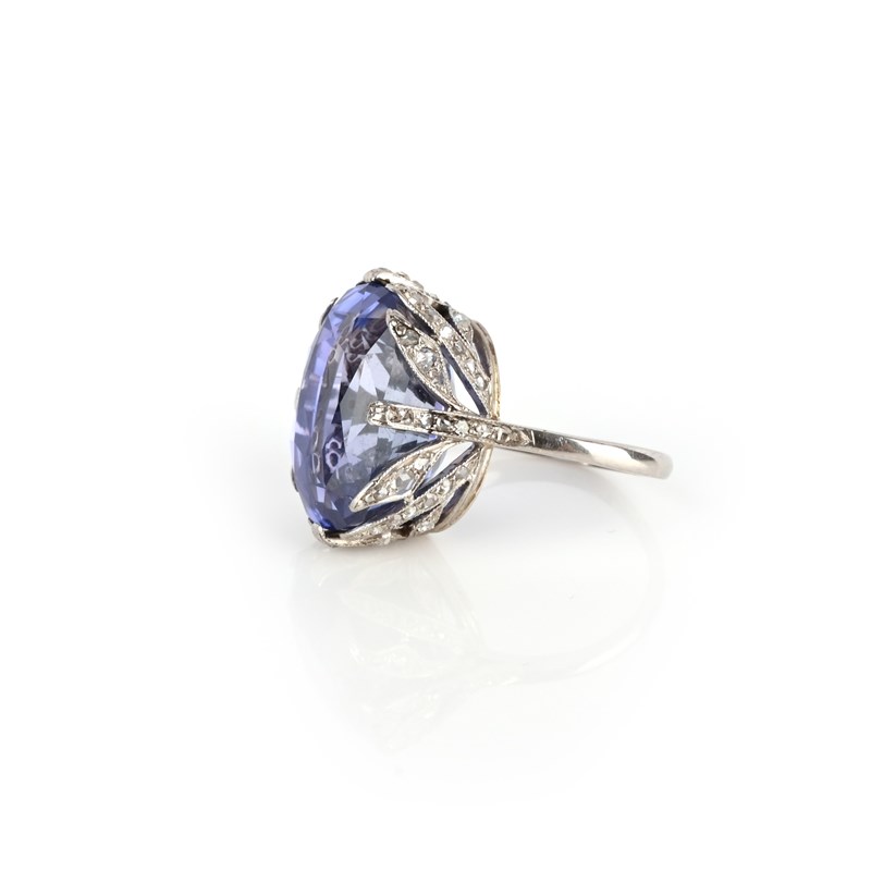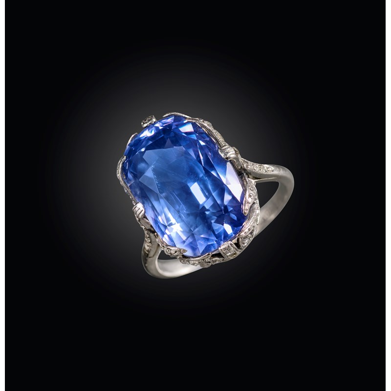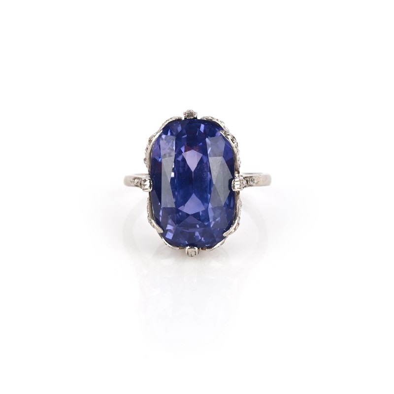A sapphire and diamond ring, the rectangular cushion-shaped sapphire weighs 21.70cts, within diamond-set stylised foliate setting in platinum, size H approximately