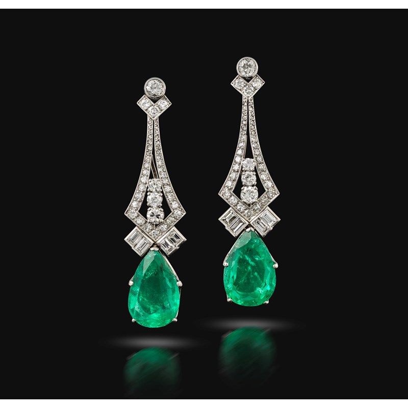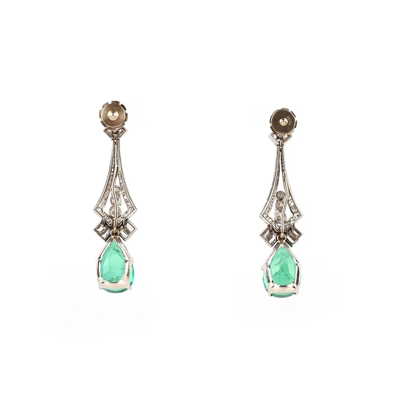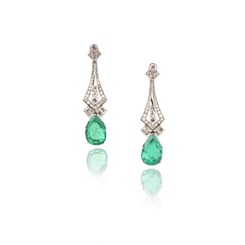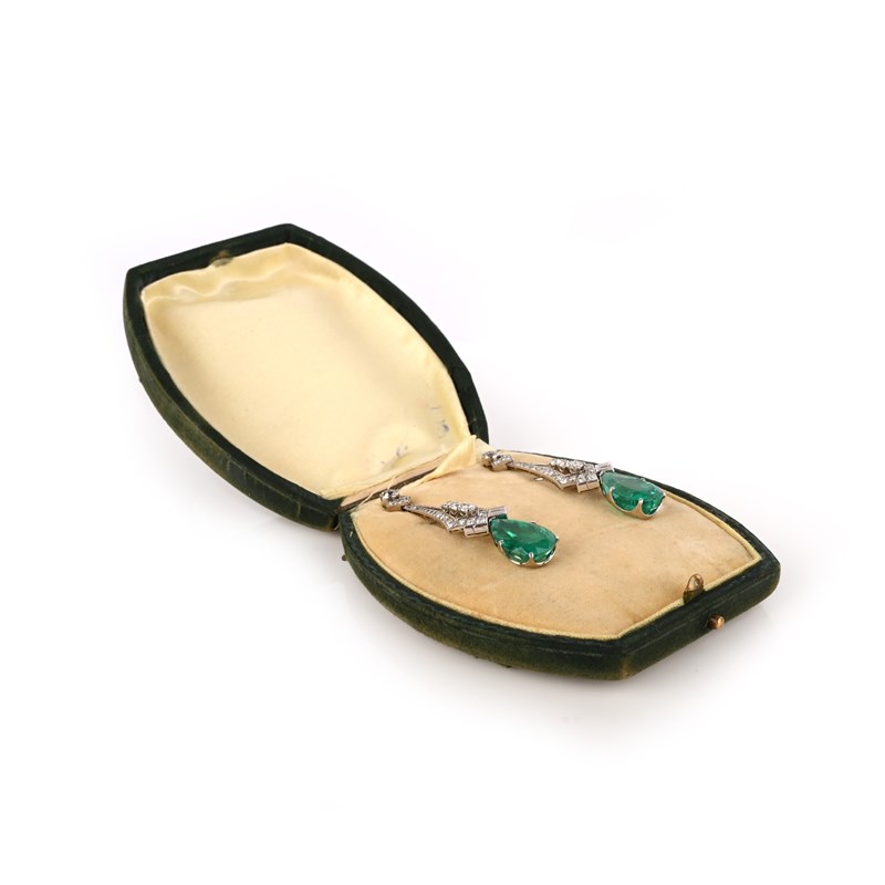 A pair of emerald and diamond earrings, each of drop design, composed of a tapering surmount set with circular-, singe- and rose-cut diamonds, suspending a pear-shaped emerald, post fittings, length 5.2cm each, case